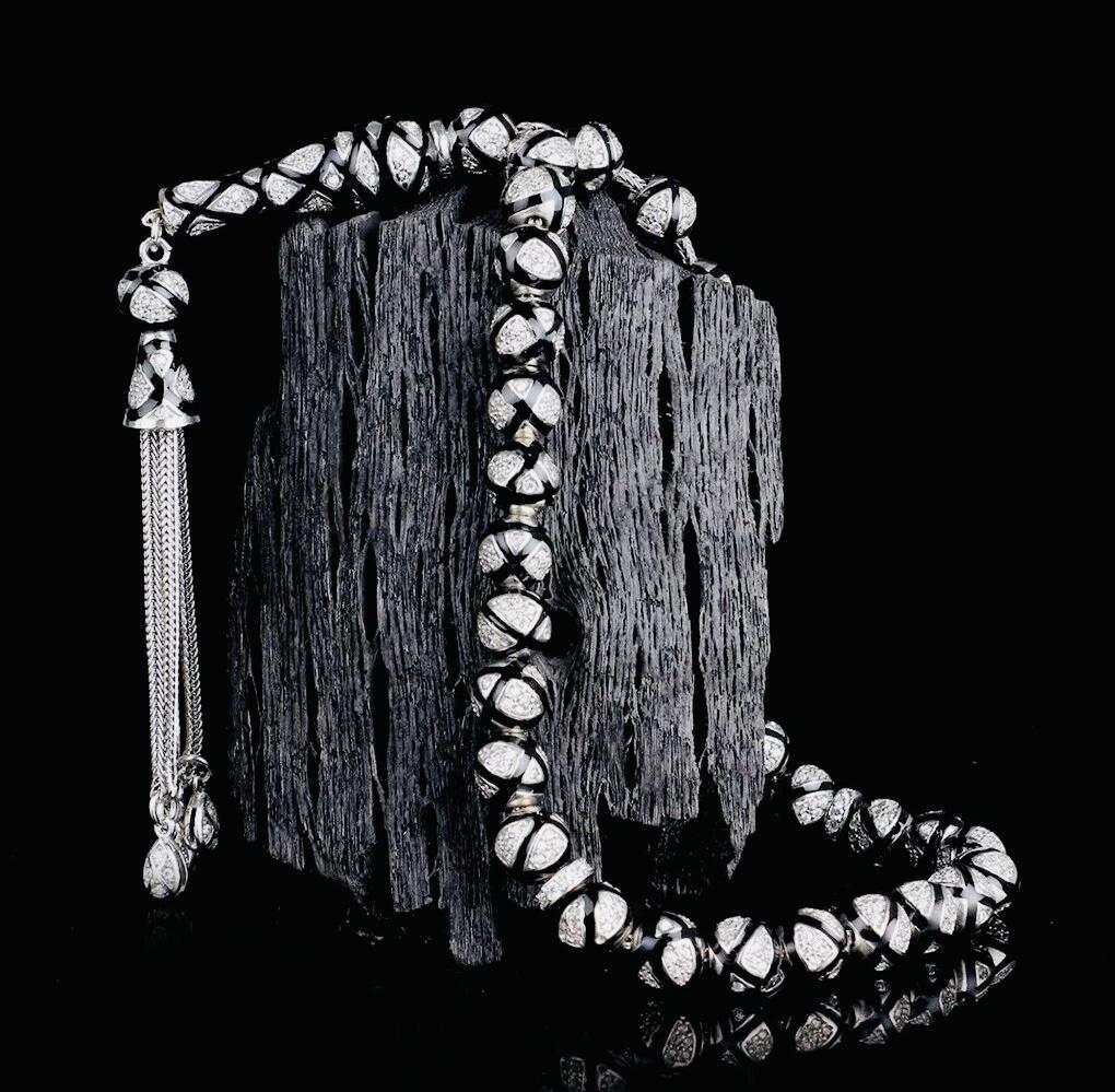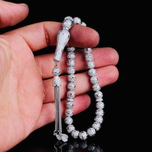 This elegant misbaha features 925 sterling silver beads with black enamel and zircon stone details. A refined accessory suitable for prayer, meditation, or as a unique gift.