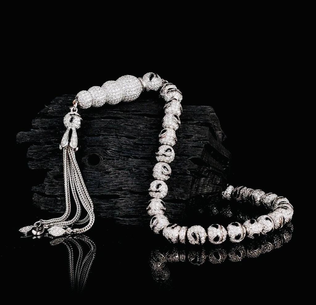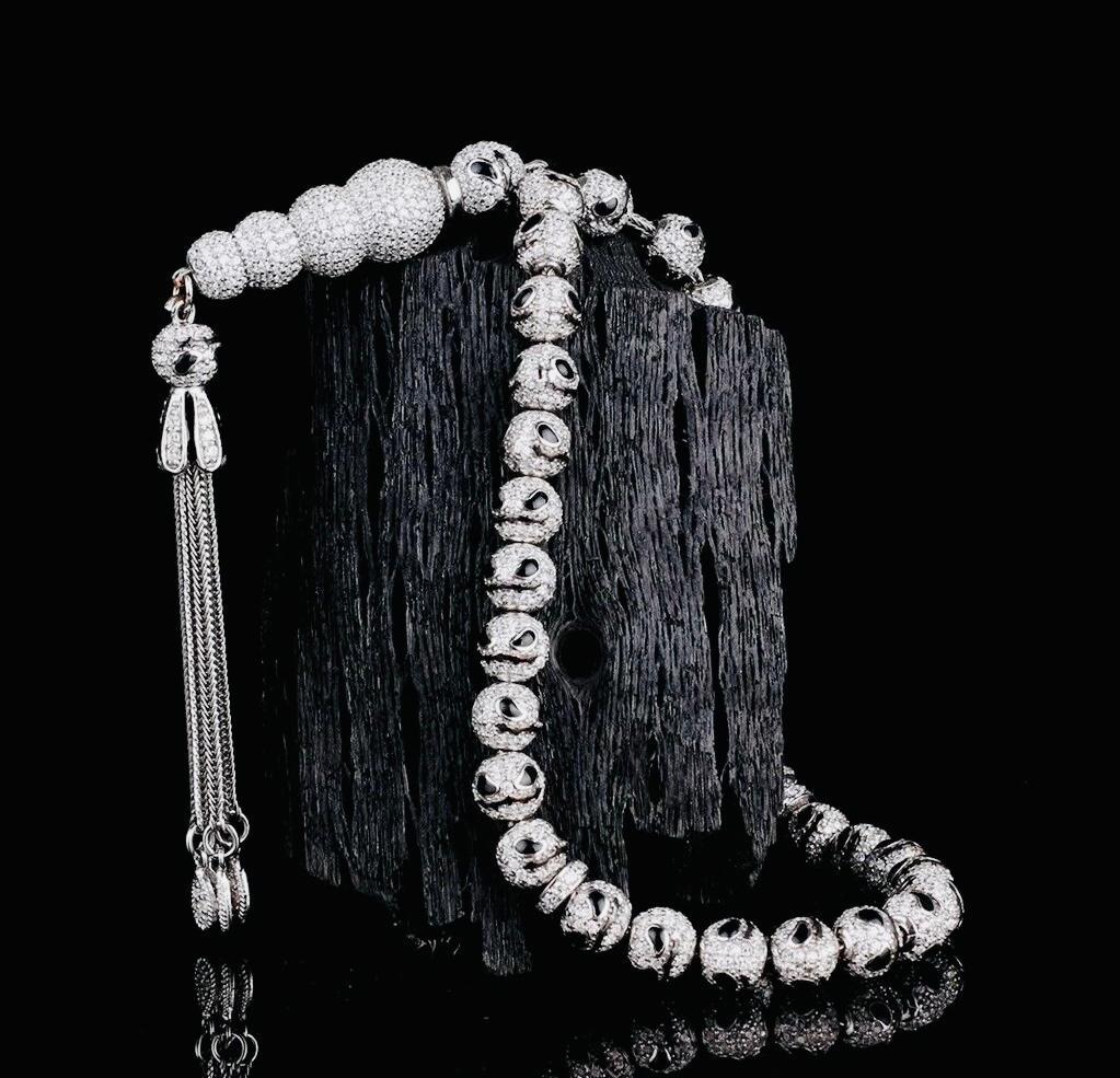 This refined misbaha is crafted from solid 925 sterling silver with black enamel and zircon stone details. A stylish accessory suitable for prayer, meditation, or as a meaningful gift.