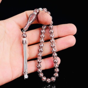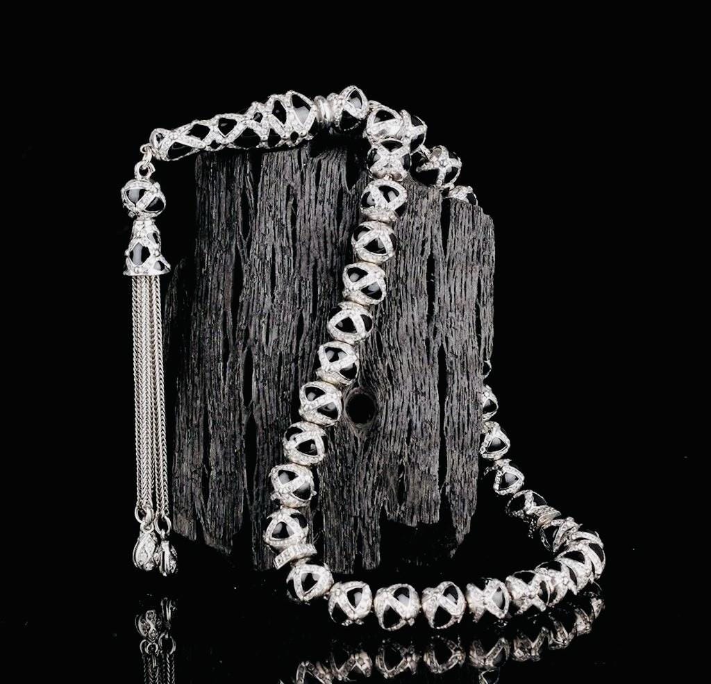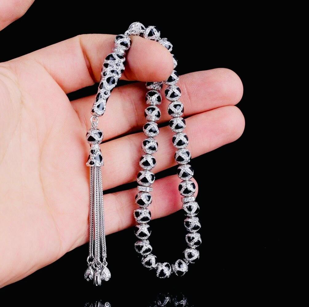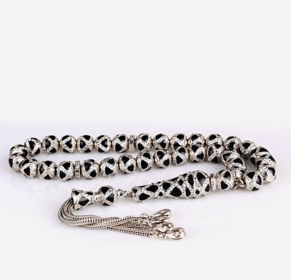 This elegant sterling silver misbaha with black enamel and zircon stones is designed for both style and spirituality. Perfect for prayer, meditation, or as a unique gift.