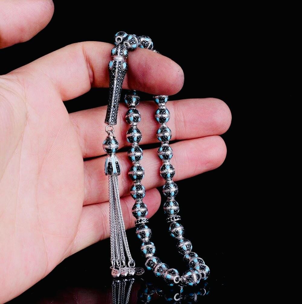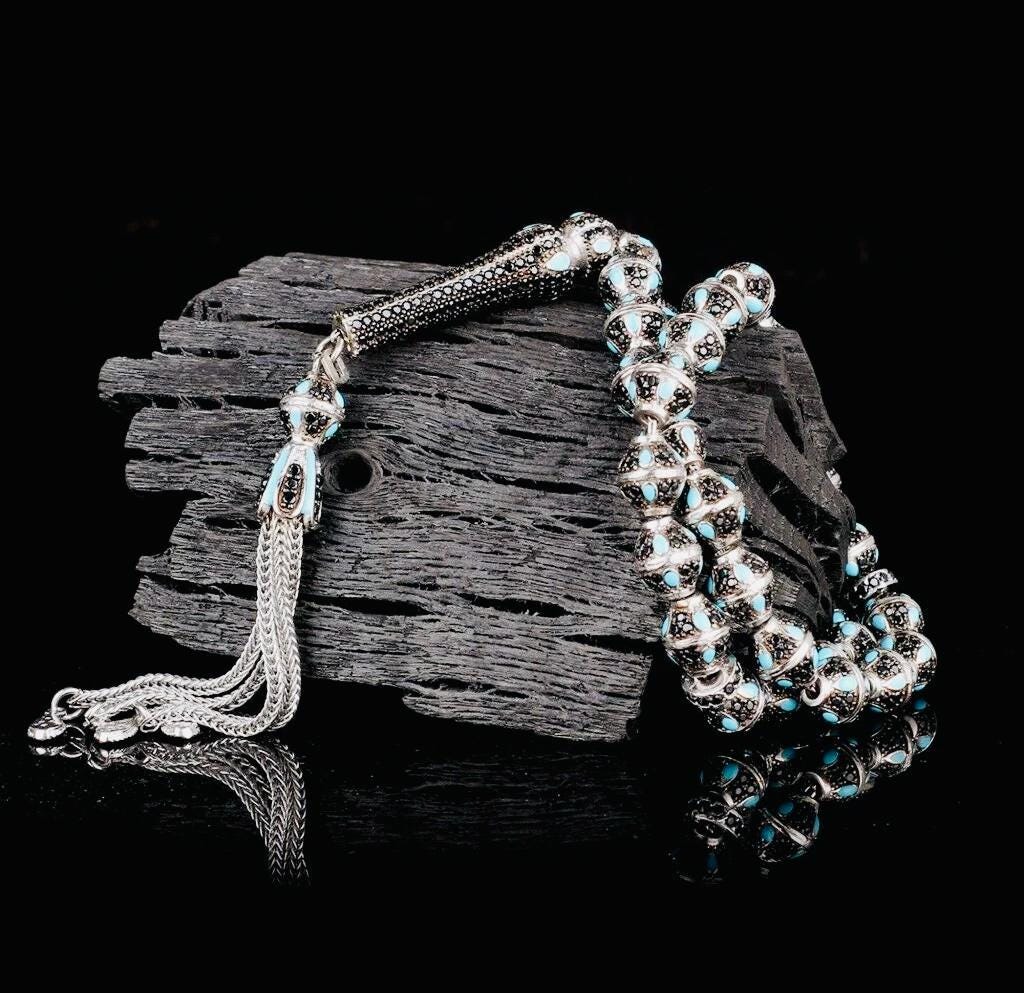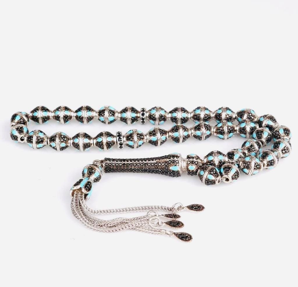 This sterling silver misbaha with turquoise enamel and zircon stone details combines elegance and craftsmanship. Perfect for daily use, prayer, or as a unique spiritual gift.