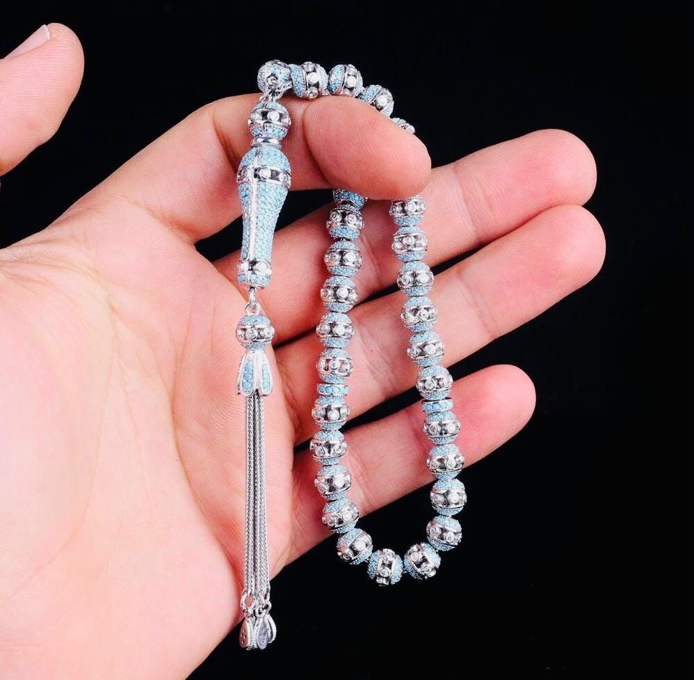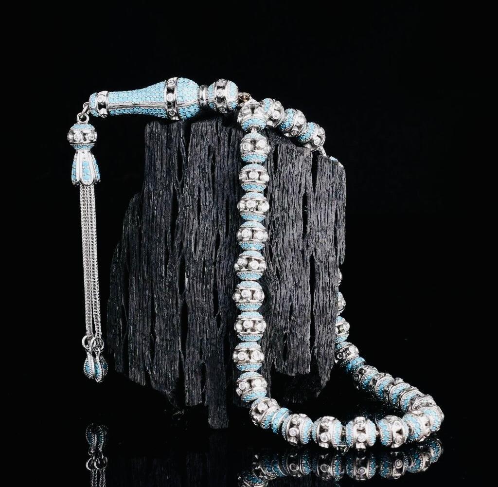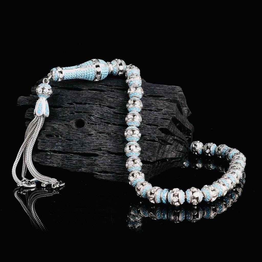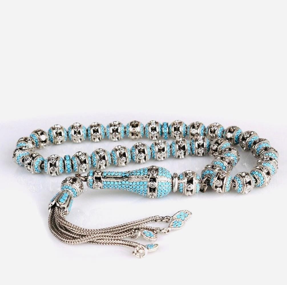 This sterling silver misbaha with turquoise micro zircon stones is crafted with elegance and durability. Perfect for prayer, meditation, or as a unique spiritual gift.