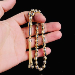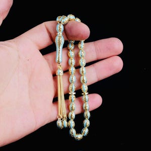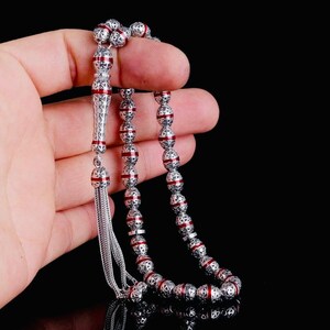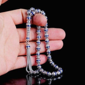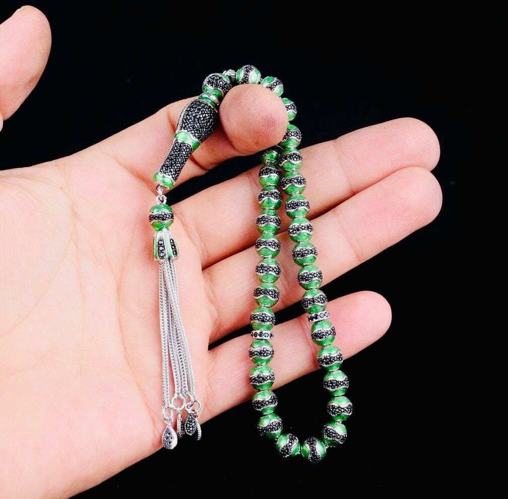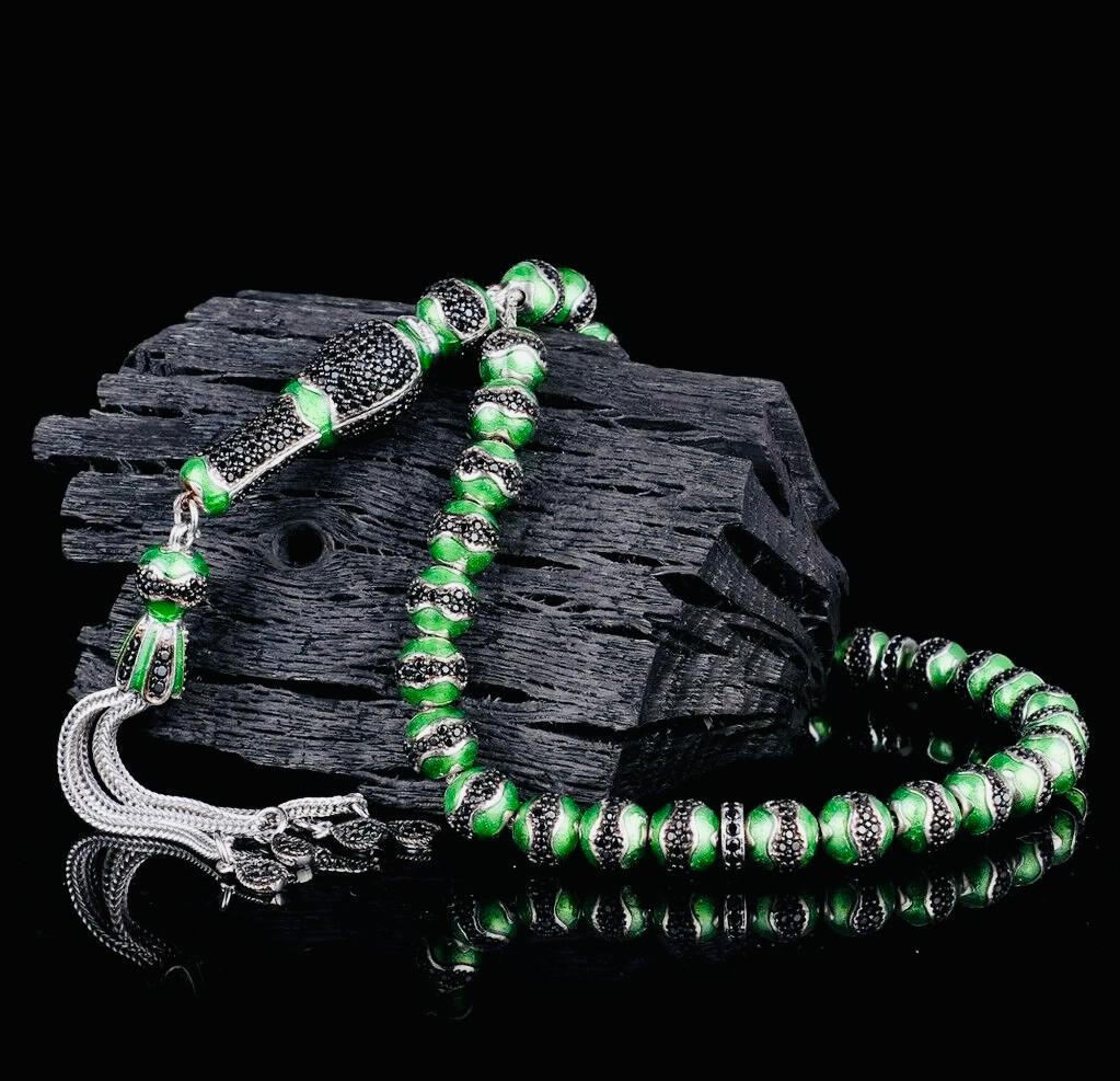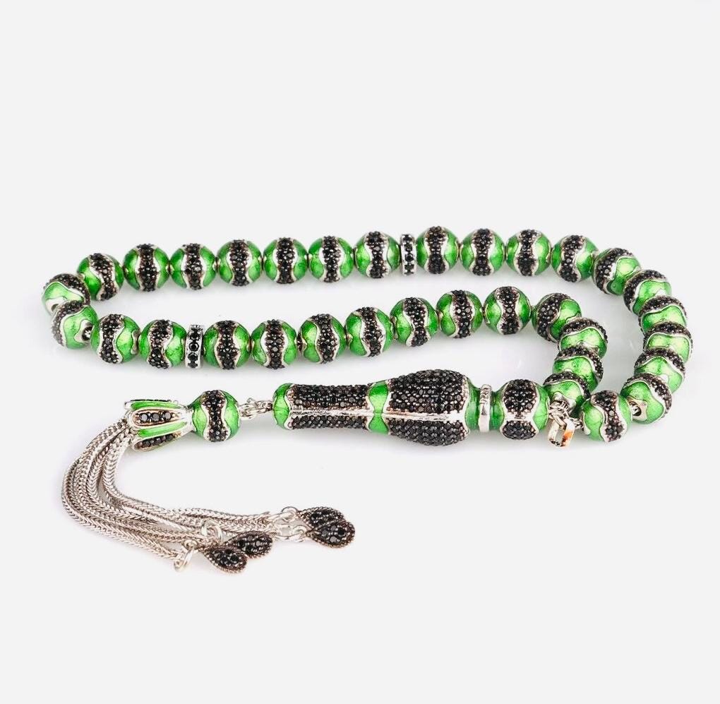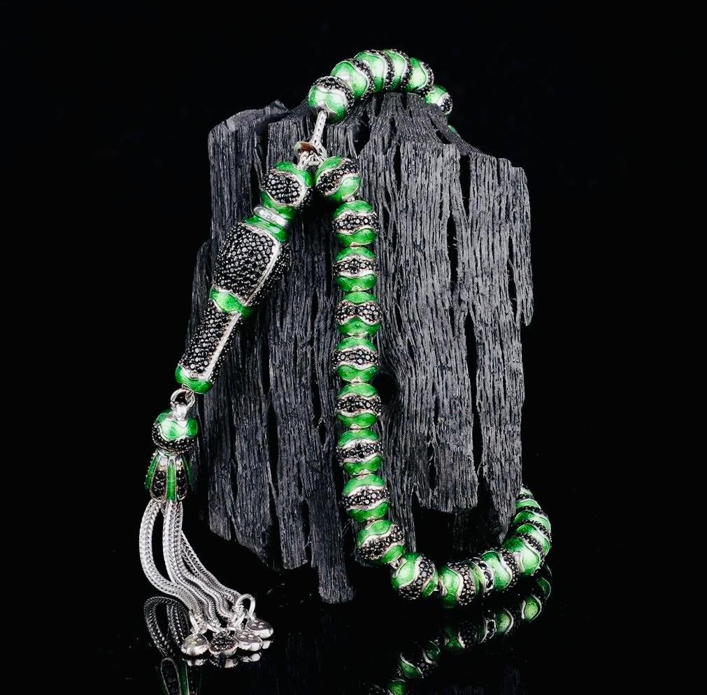 A unique misbaha made of solid sterling silver, featuring elegant green enamel and zircon details. Perfect for prayer, meditation, or as a special gift.