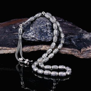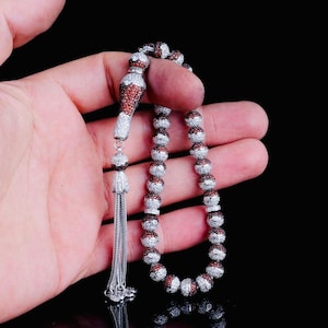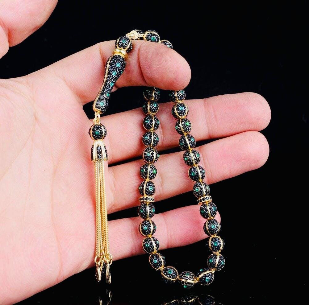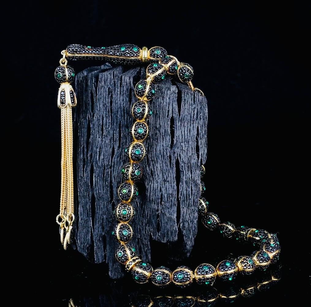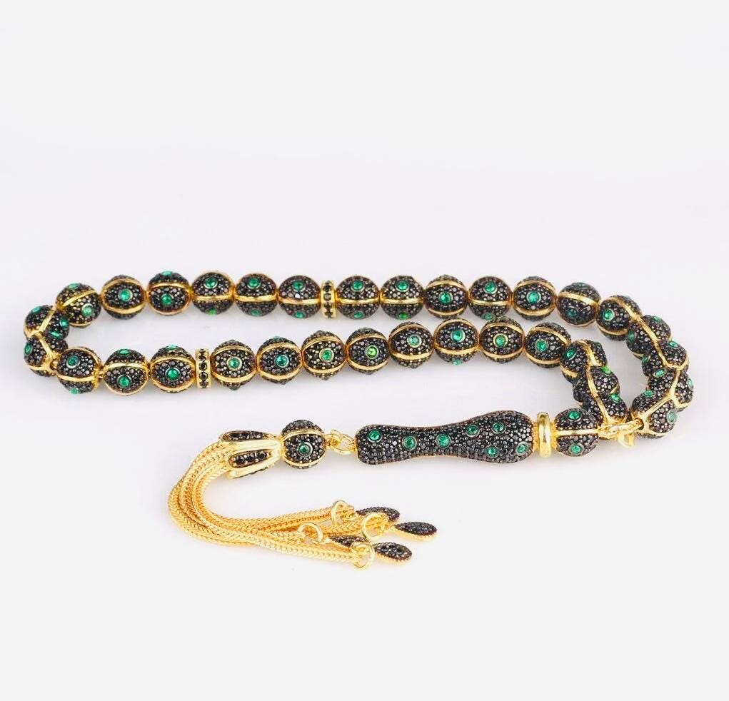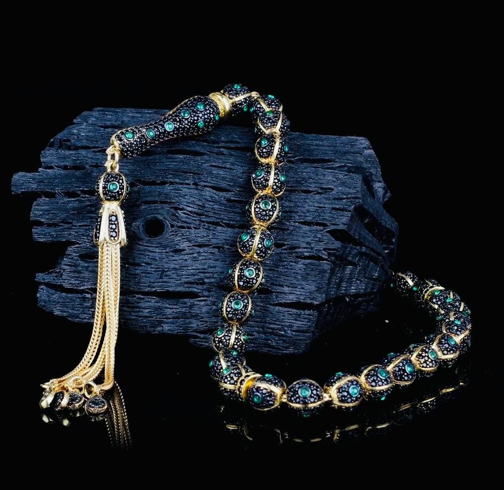 A beautifully crafted misbaha made entirely of sterling silver with elegant green zircon inlays. Perfect for daily use, prayer, meditation, or as a meaningful gift.