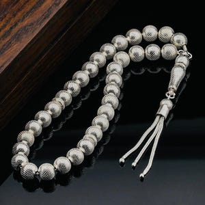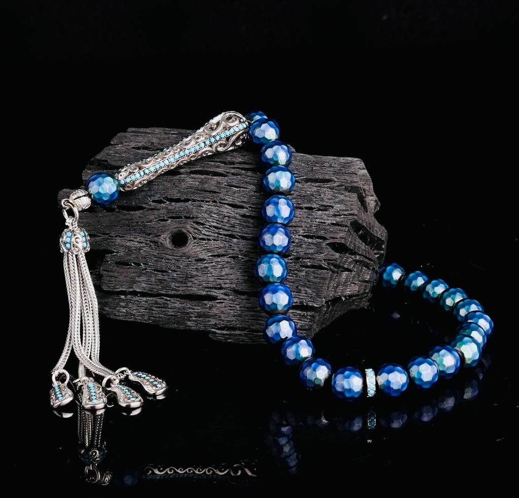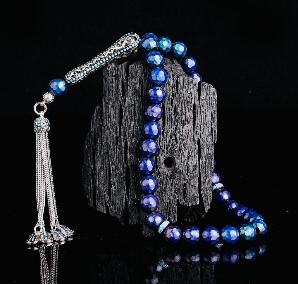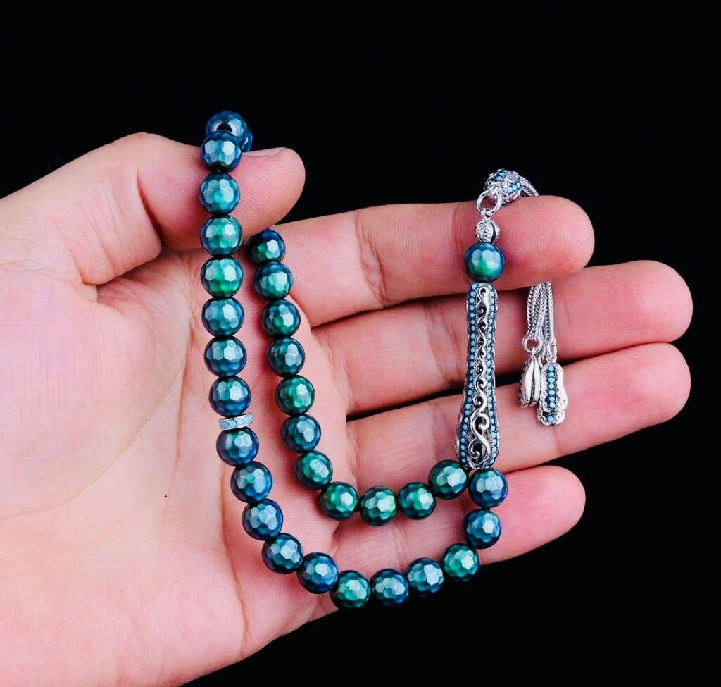 This misbaha features genuine mood stones that change color with body heat, combined with zircon inlays and a sterling silver tassel. A unique piece for prayer, meditation, or as a meaningful gift.