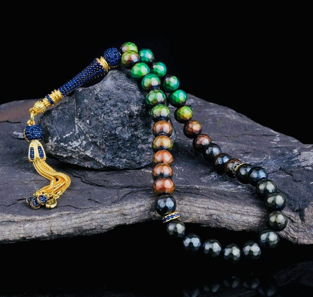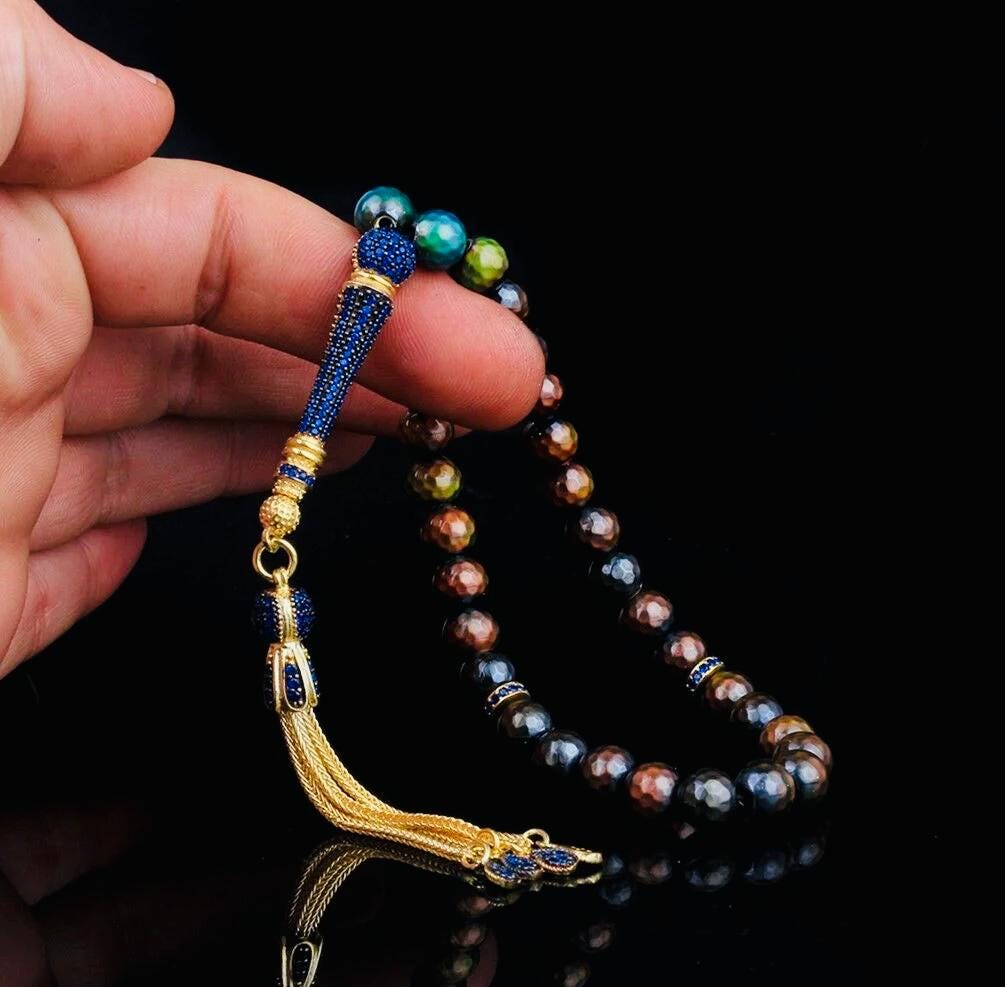 This misbaha features genuine mood stones that change color with body heat, accented with zircon inlay and a sterling silver tassel. A unique piece for prayer, meditation, or as a meaningful gift.
