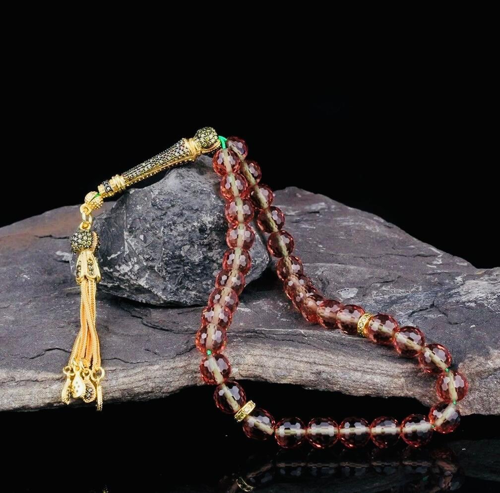 This misbaha is crafted with Sultanite stones that uniquely change color under different lighting. Enhanced with zircon details and a sterling silver tassel, it makes a perfect choice for prayer, meditation, or as a collector’s item.