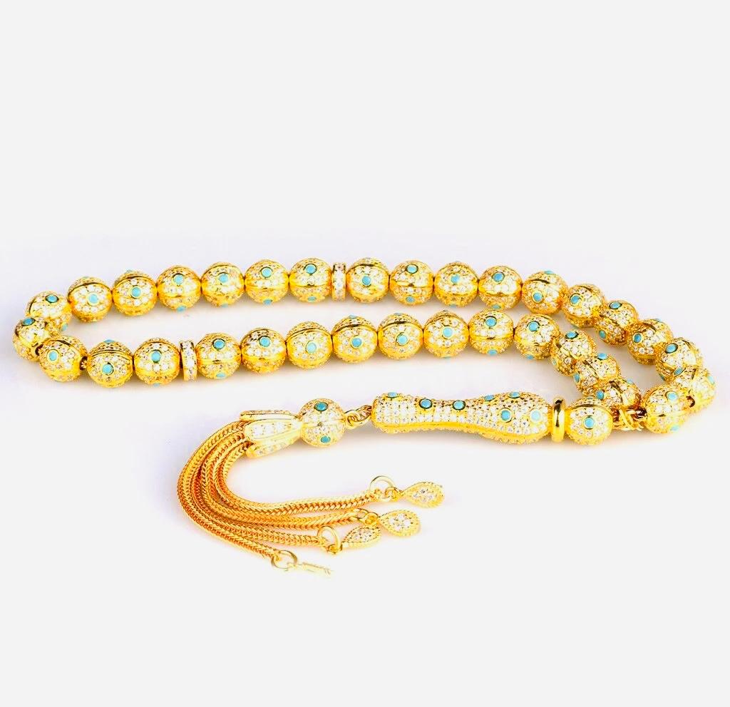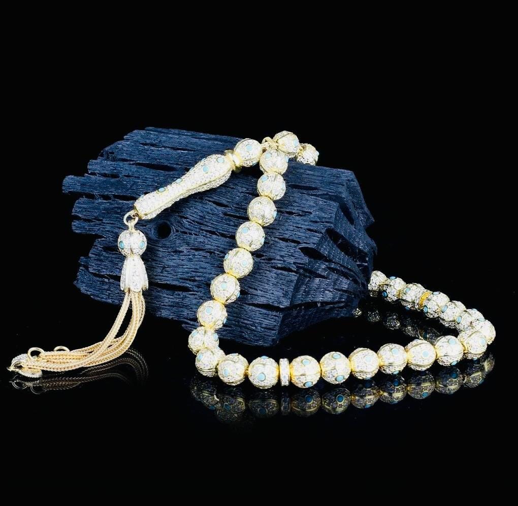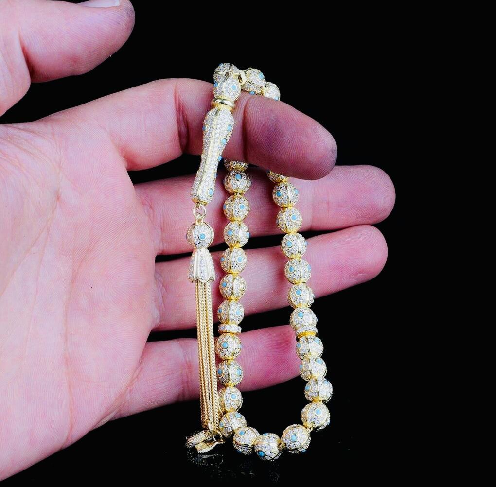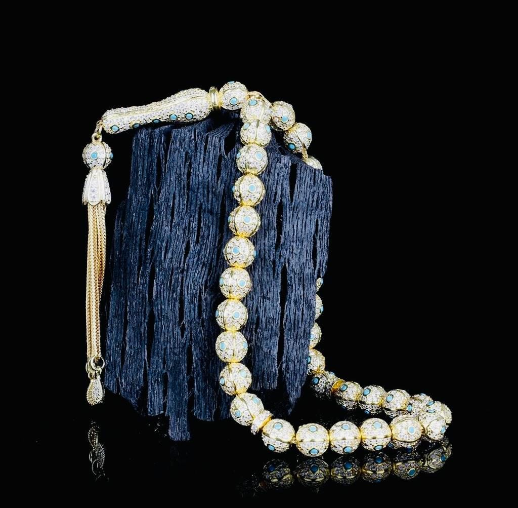 This misbaha is crafted from solid 925 sterling silver, enhanced with sparkling zircon stones and finished in elegant gold plating. A refined piece, perfect for prayer, meditation, collection, or as a distinguished gift.