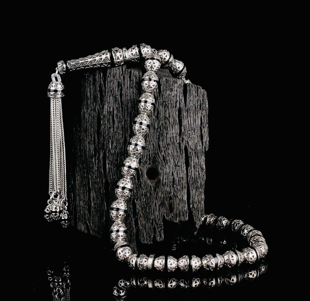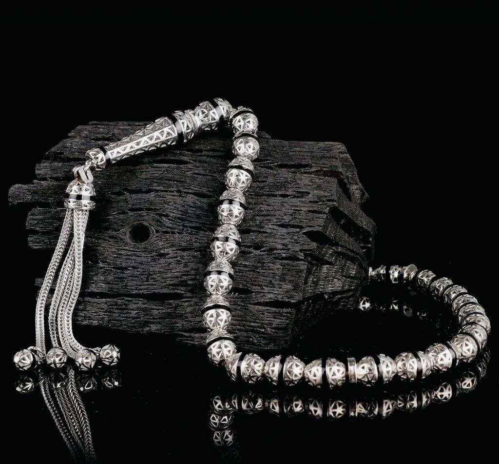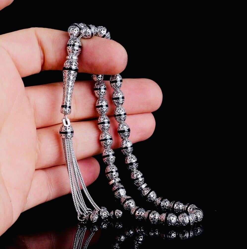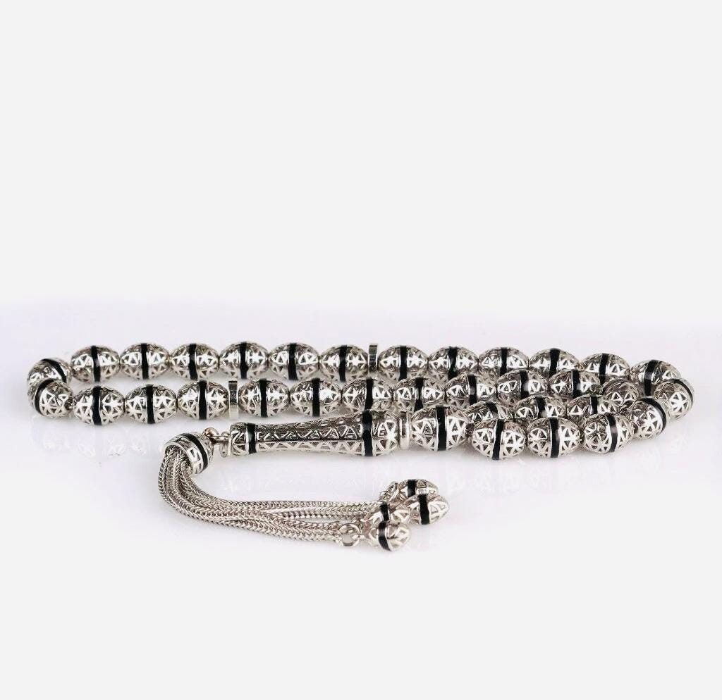 This elegant misbaha is crafted from 925 sterling silver with a sleek black enamel finish. Its oval (arpa) cut beads combine elegance and durability, making it perfect for prayer, meditation, or as a valuable gift.