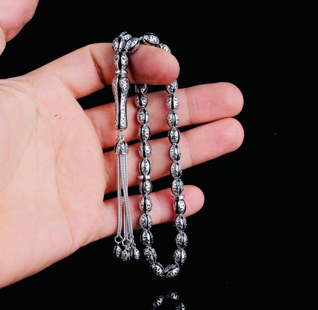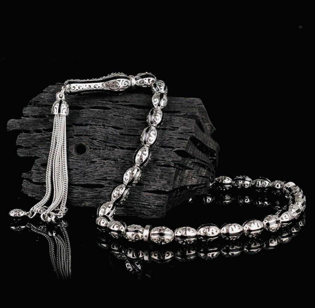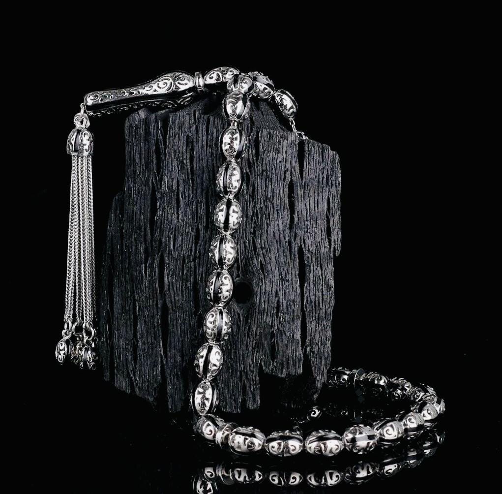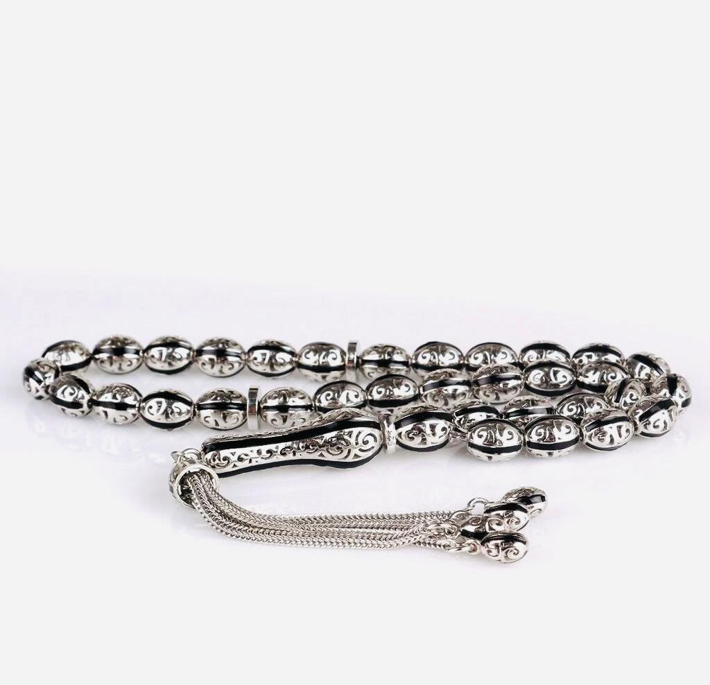 Crafted from 925 sterling silver, this arpa (oval) cut misbaha features elegant black enamel design. With its refined craftsmanship, it is ideal for prayer, meditation, or as a unique collector’s item.