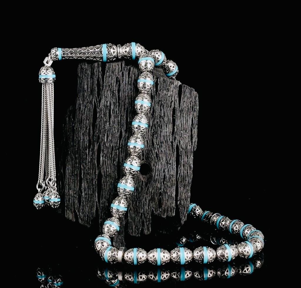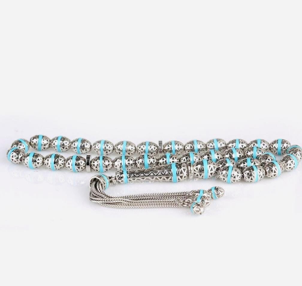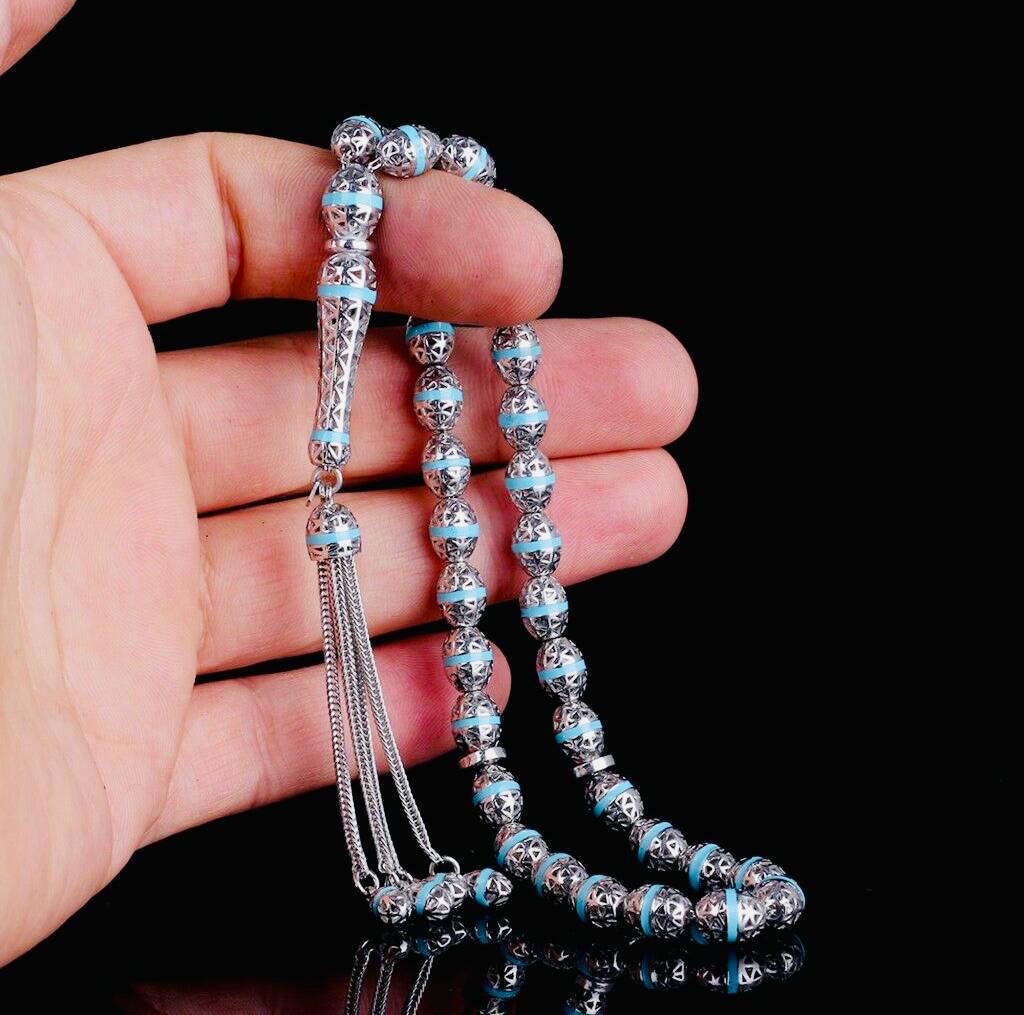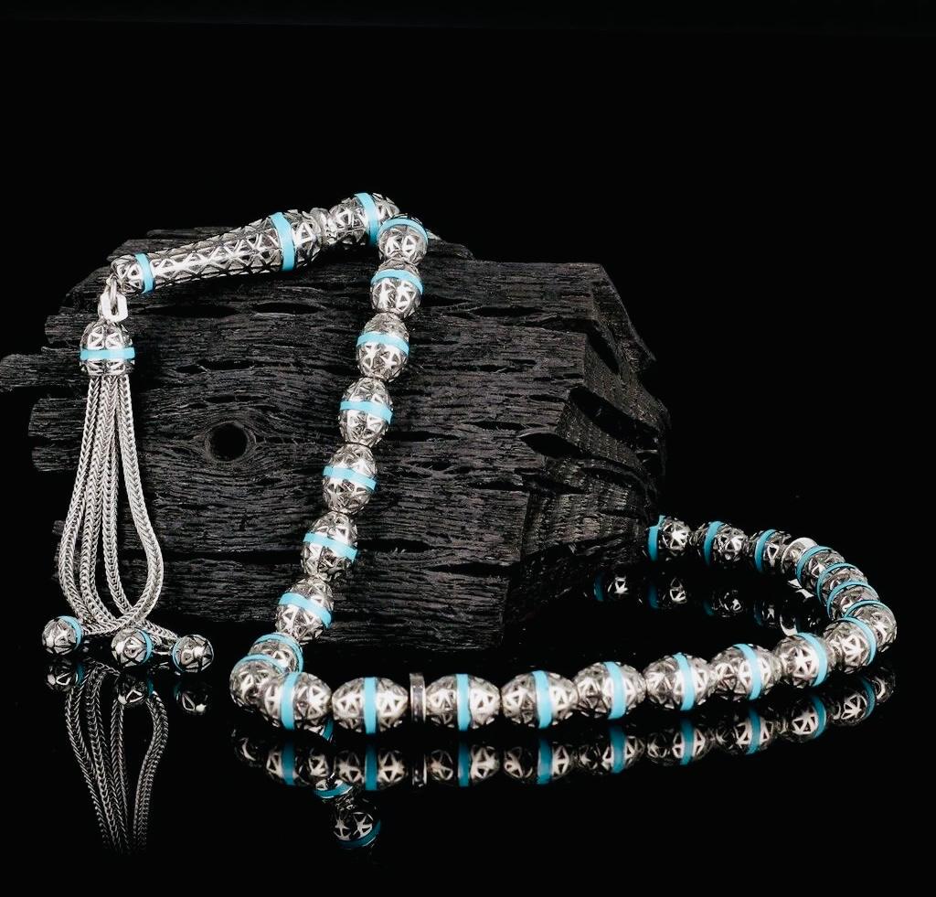 This elegant misbaha is crafted from 925 sterling silver with a beautiful turquoise enamel finish. Its oval (arpa) cut beads and unique design make it perfect for prayer, meditation, or as a meaningful gift. A timeless accessory with collectible value.