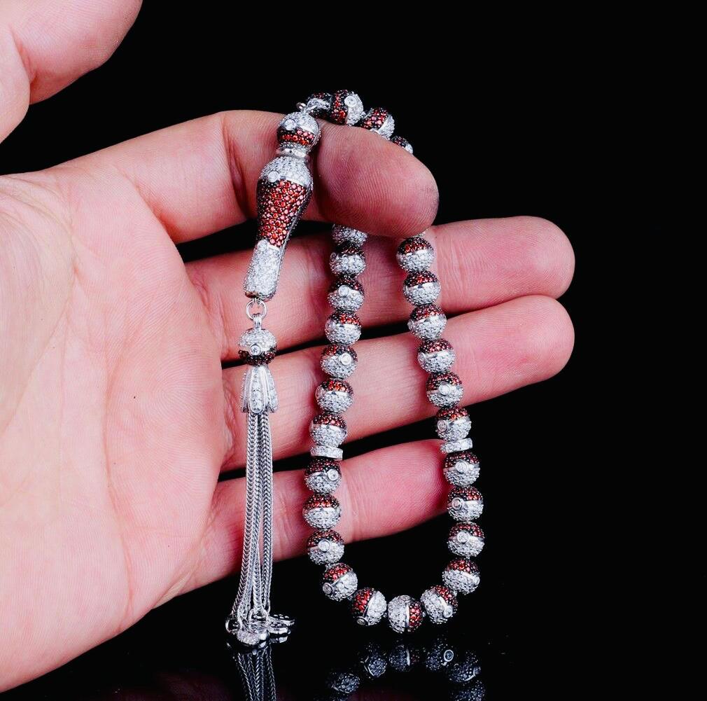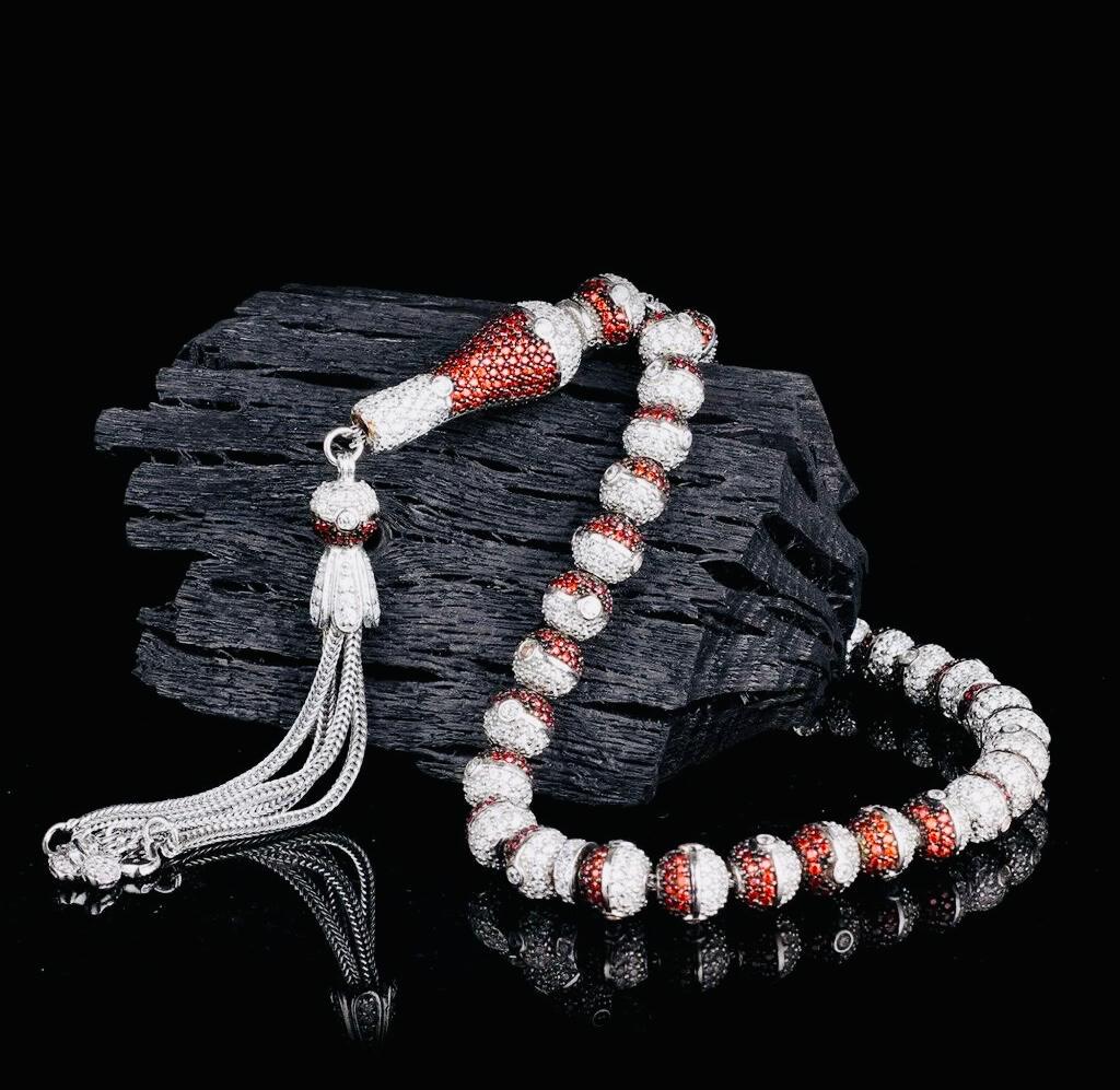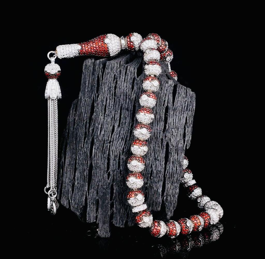 Crafted from solid 925 sterling silver, this tasbih features red and white zircon stone details. With its elegant design and weight, it is suitable for prayer, meditation, or as a meaningful gift. Comes in a gift box.
