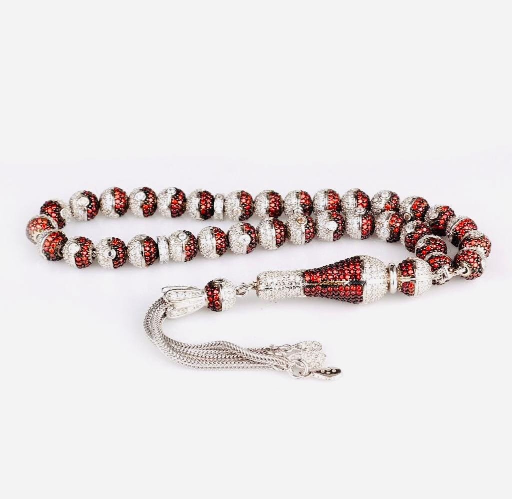 925 Sterling Silver Tasbih – Red White Zircon – 7.6 mm