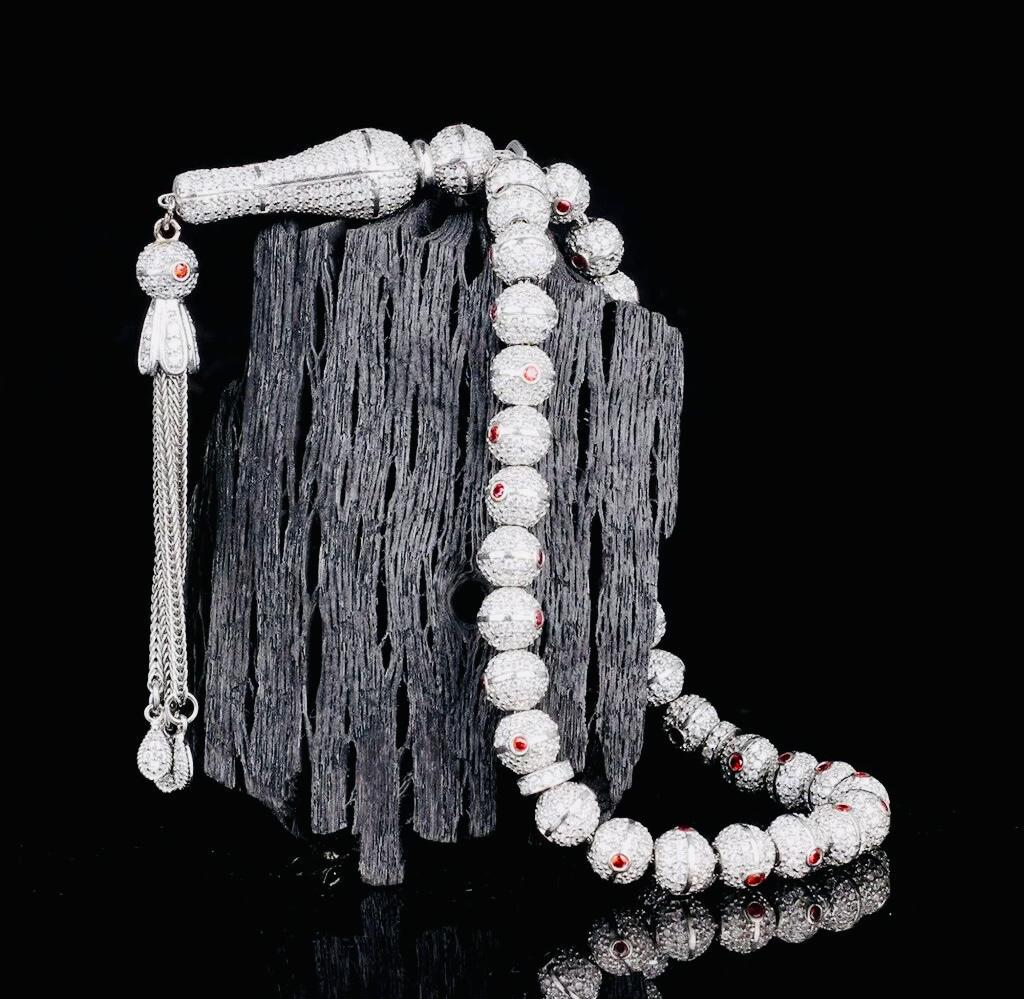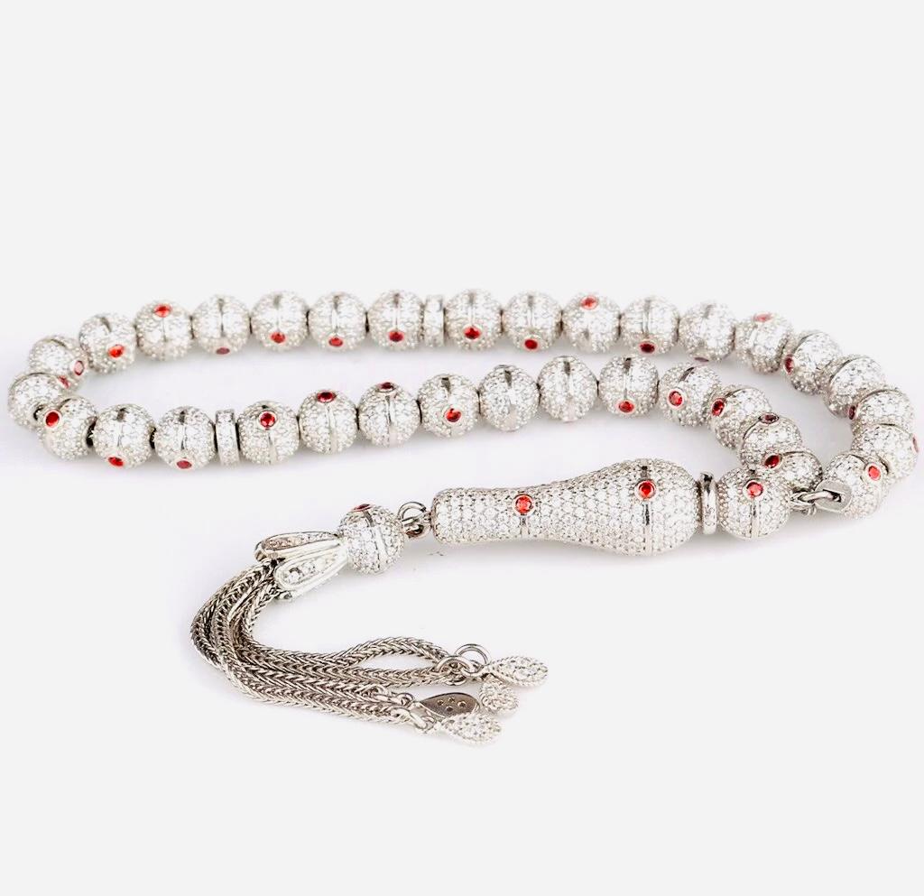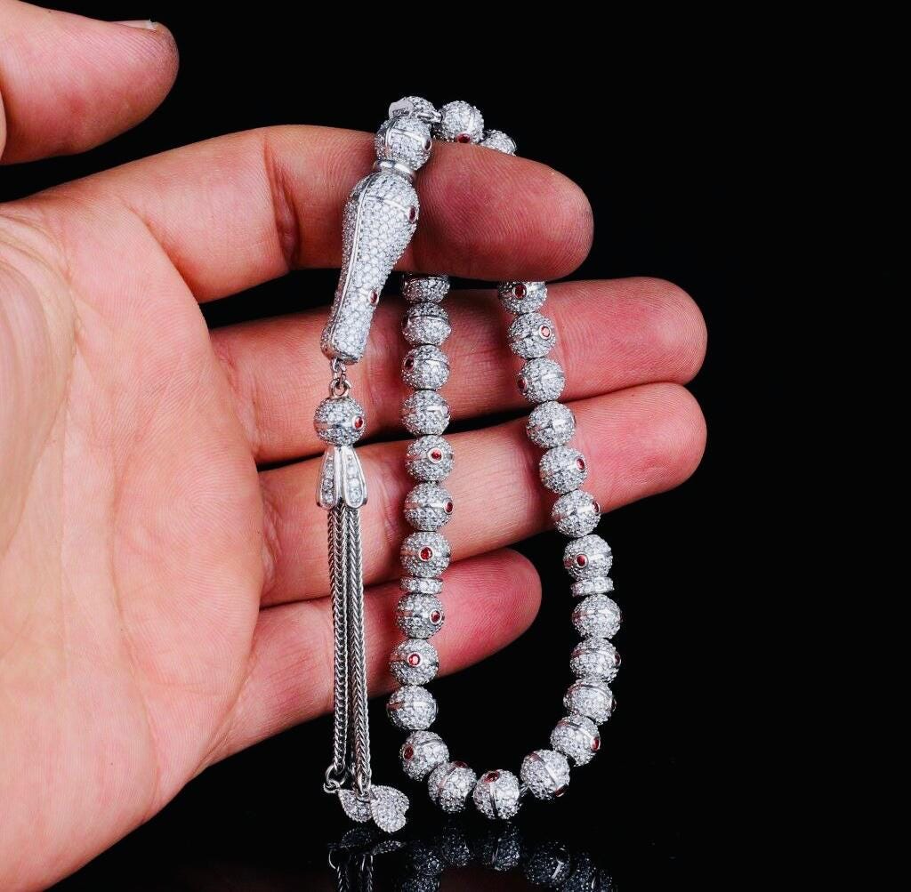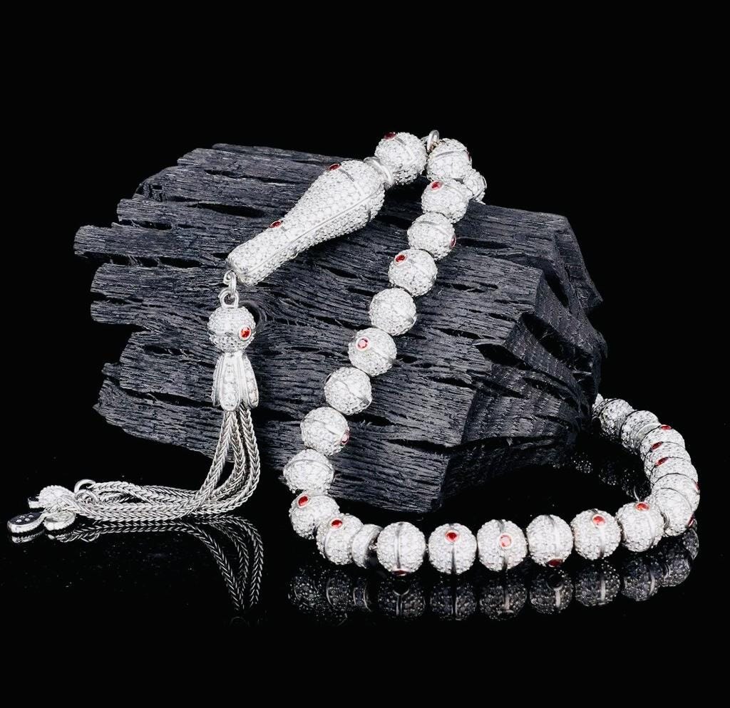 This tasbih is made of solid 925 sterling silver with elegant red and white zircon stone details. with 7.6 mm beads, it is a durable and stylish choice. Perfect for prayer, meditation, or as a meaningful Islamic gift. Comes in a gift box.