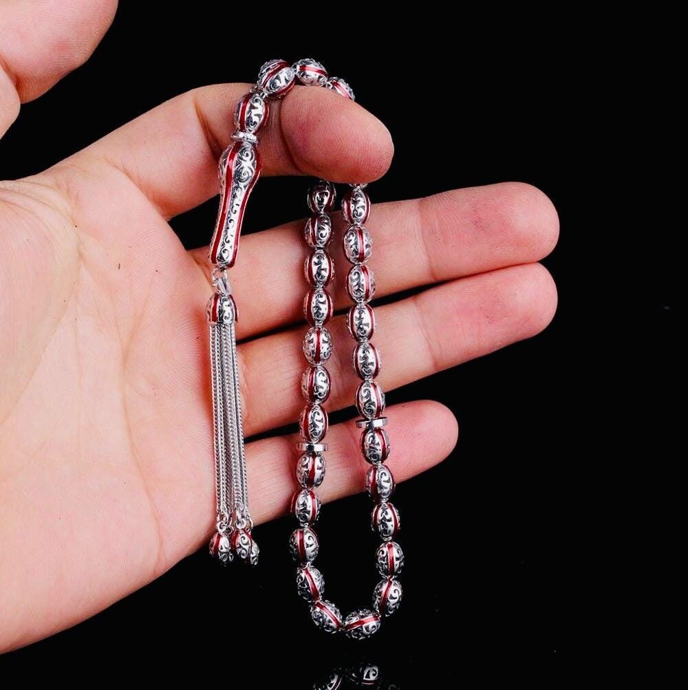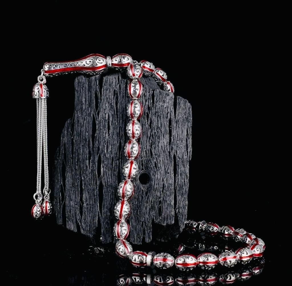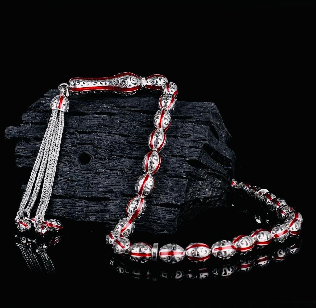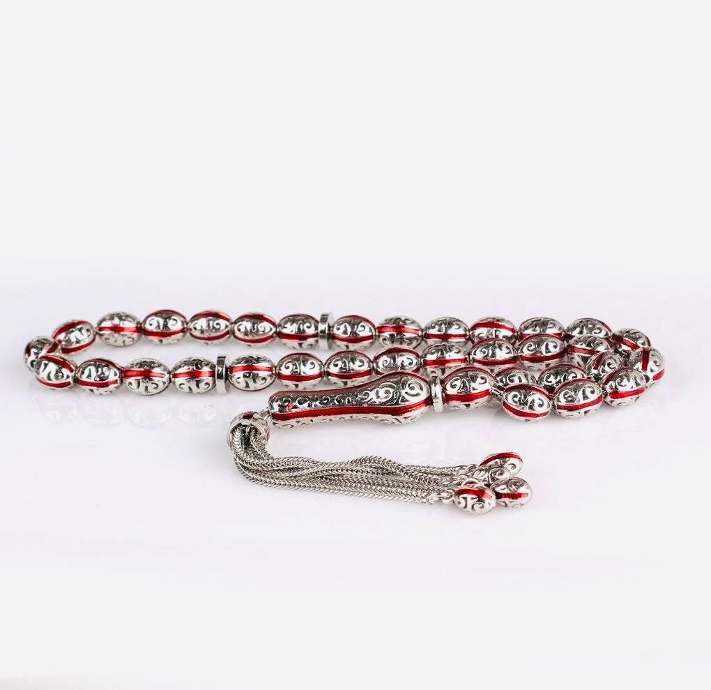 This tasbih is crafted from solid 925 sterling silver with elegant red enamel detailing. featuring 6.5x8 mm beads, it combines elegance and durability. Perfect for daily prayer, meditation, or as a meaningful Islamic gift. Comes in a gift box.