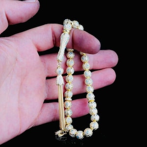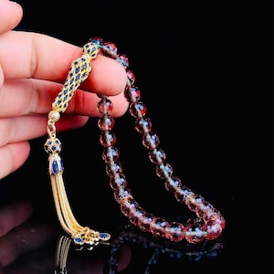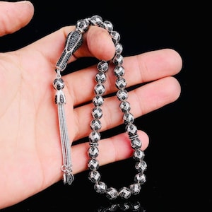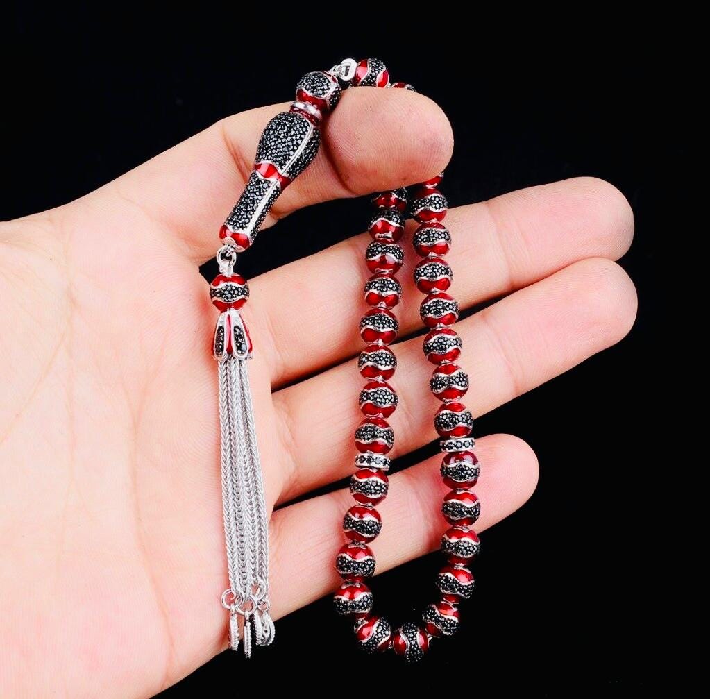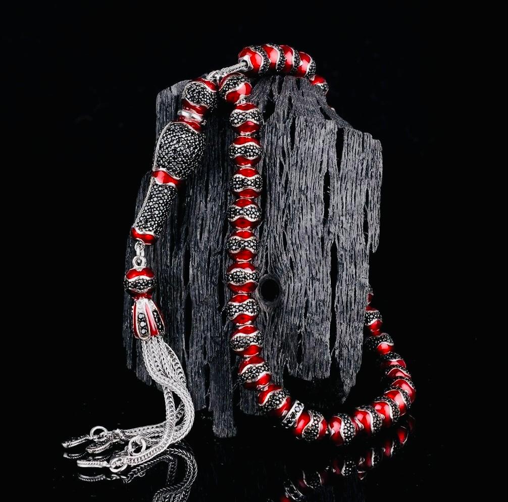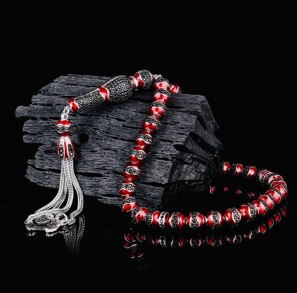 This tasbih is made of solid 925 sterling silver with elegant red enamel and zircon details. With 7.3 mm beads and a weight of it is both durable and stylish. Perfect for prayer, meditation, or as a meaningful Islamic gift. Comes in a gift box.