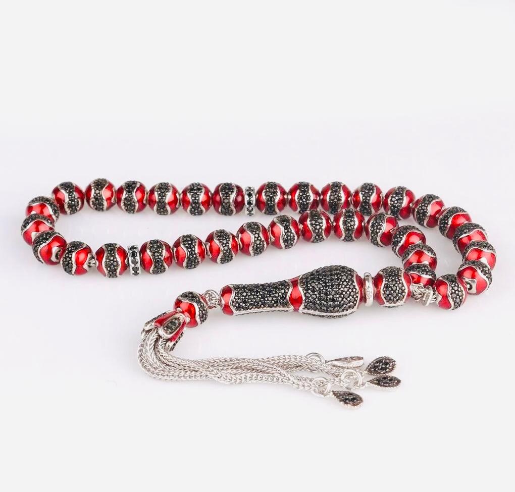 925 Sterling Silver Tasbih – Red Enamel & Zircon – 7.3 mm