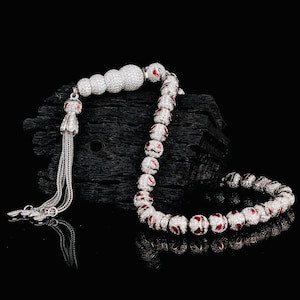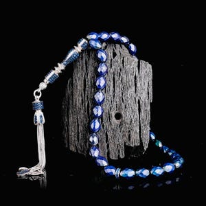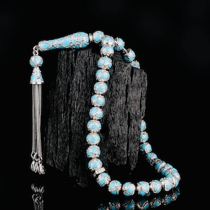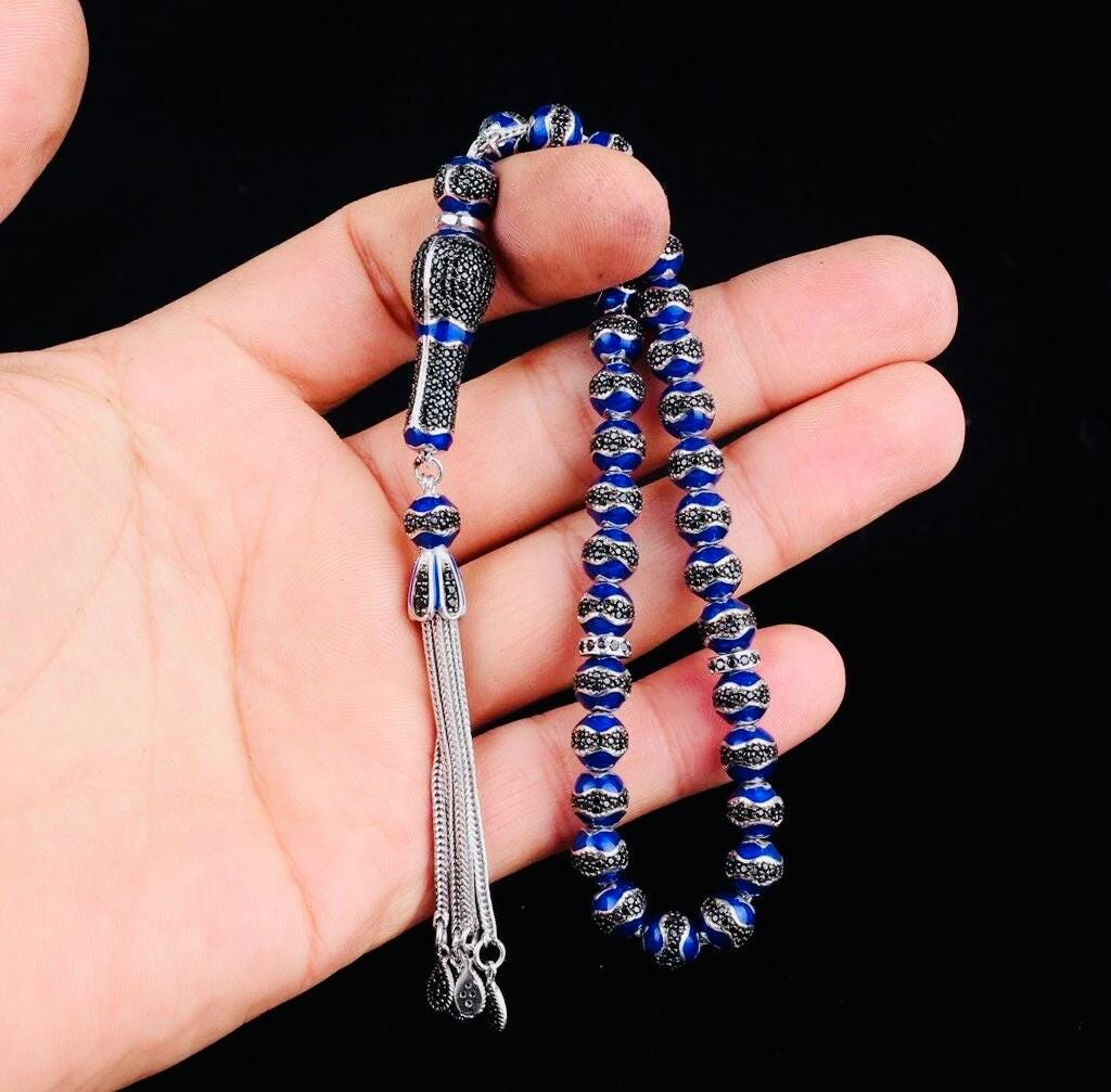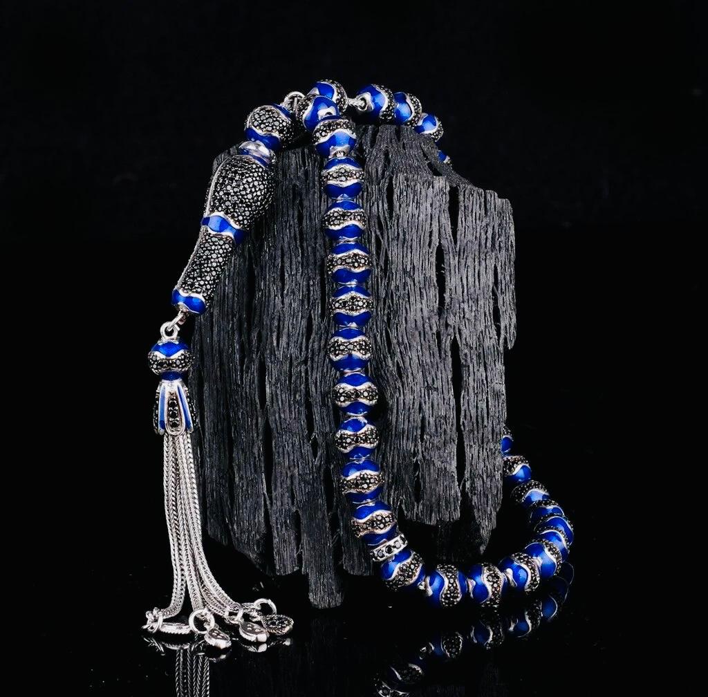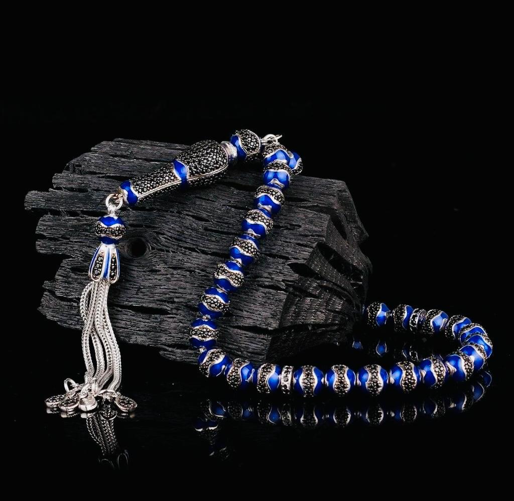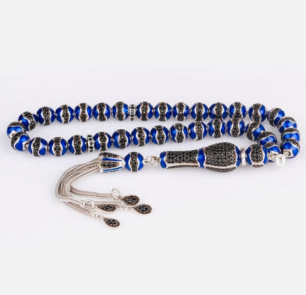 Crafted from solid 925 sterling silver, this tasbih features elegant blue enamel with zircon stone details. Weighing 46.18 g, it is both stylish and durable. Ideal for prayer, meditation, or as a meaningful gift. Comes in a gift box.