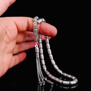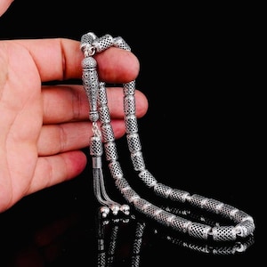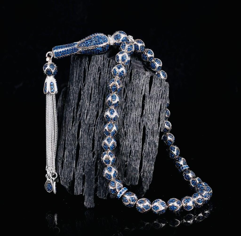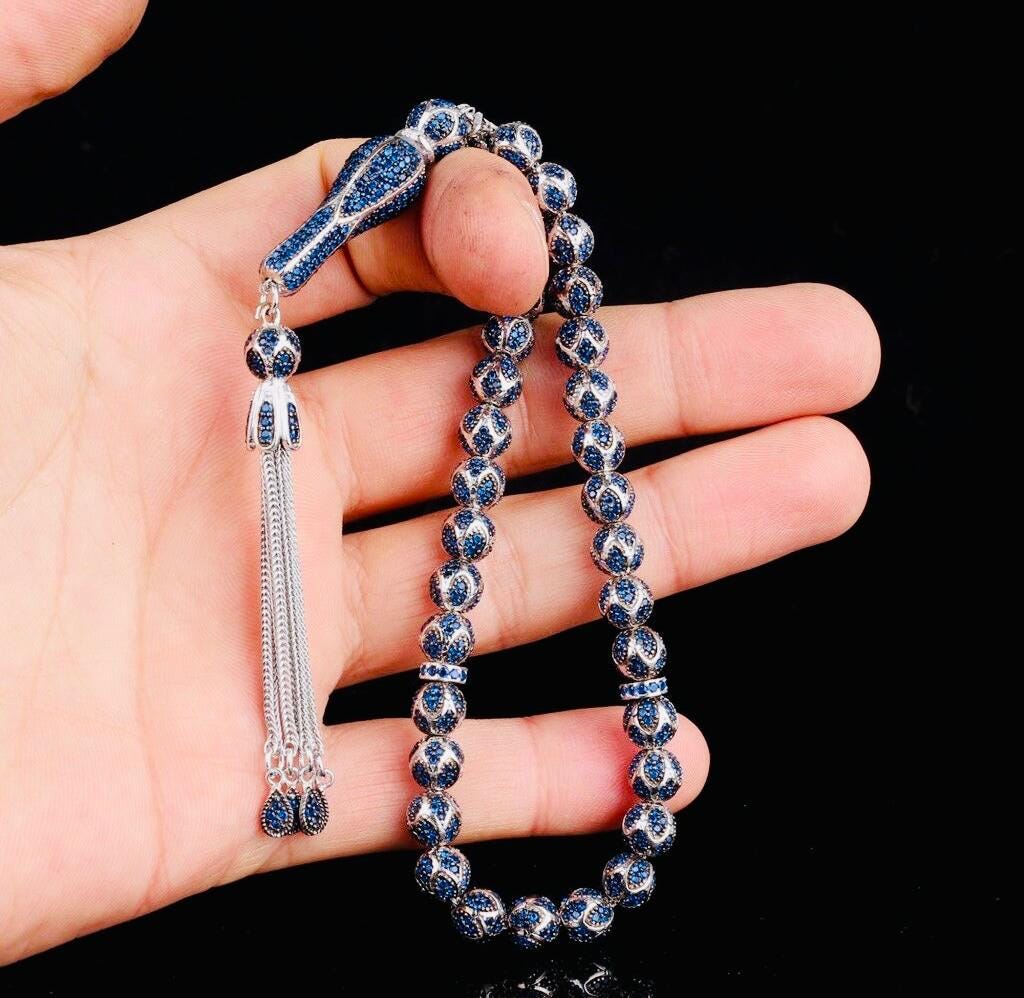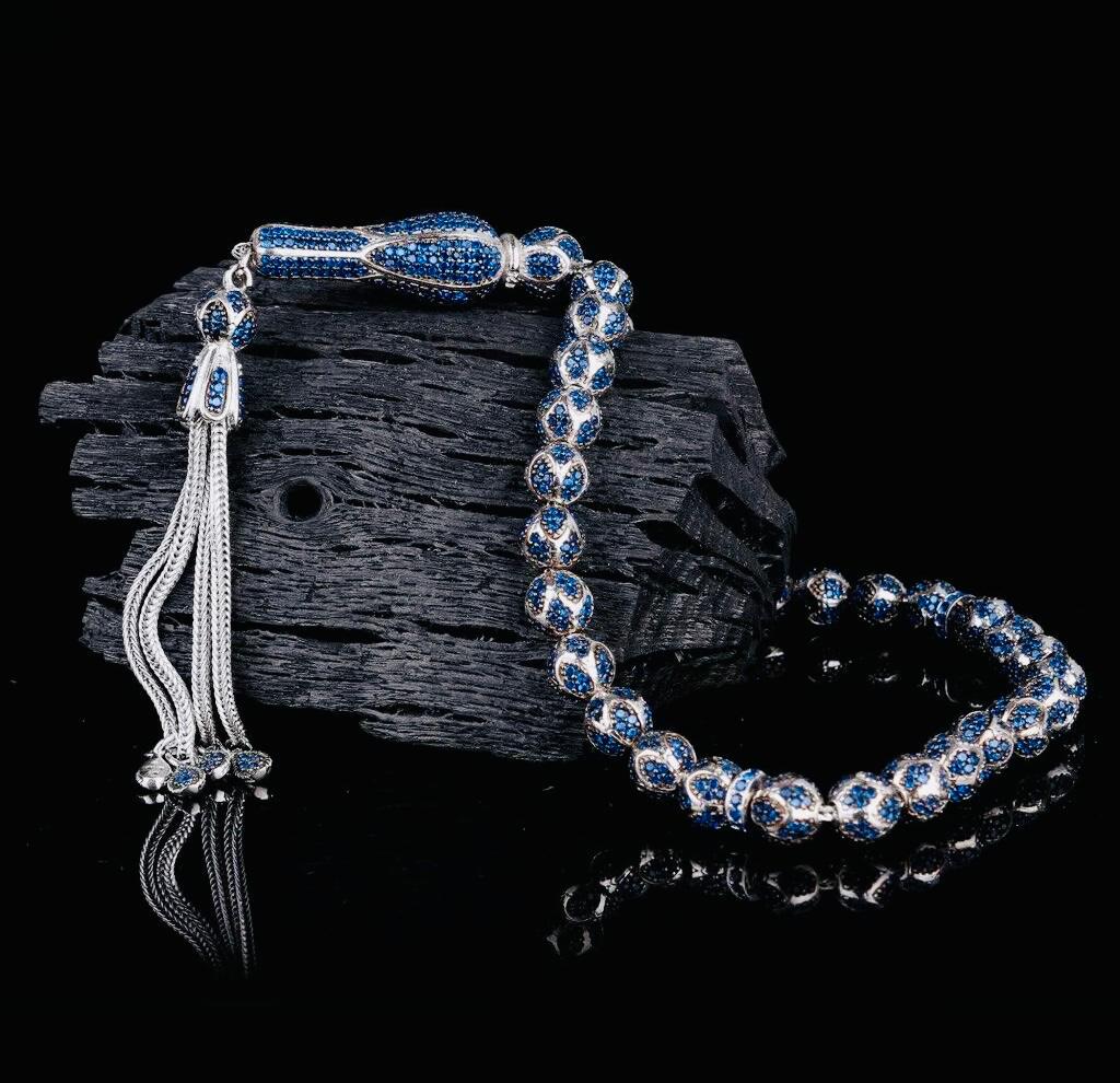 This tasbih is fully crafted from 925 sterling silver with striking blue zircon stone accents. With a weight of it offers both elegance and durability. Perfect for prayer, meditation, or as a thoughtful gift. Comes in a stylish gift box.