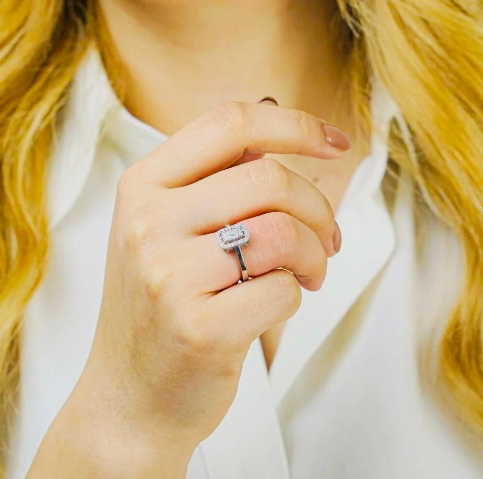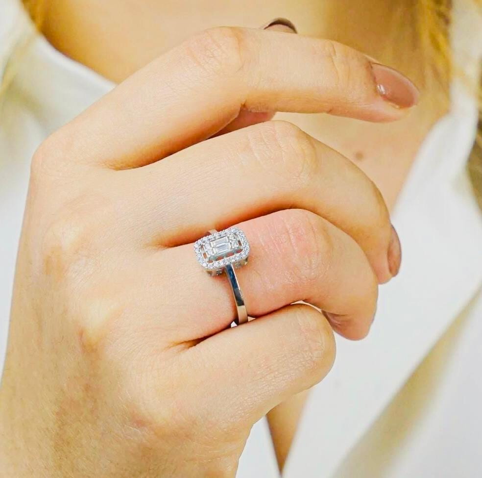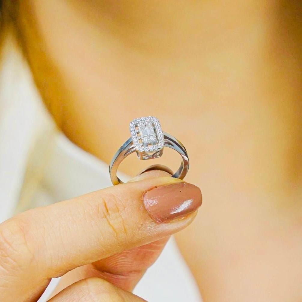 This sterling silver ring features a baguette-cut stone in a diamond-inspired design, offering a timeless sparkle for everyday elegance or special occasions.