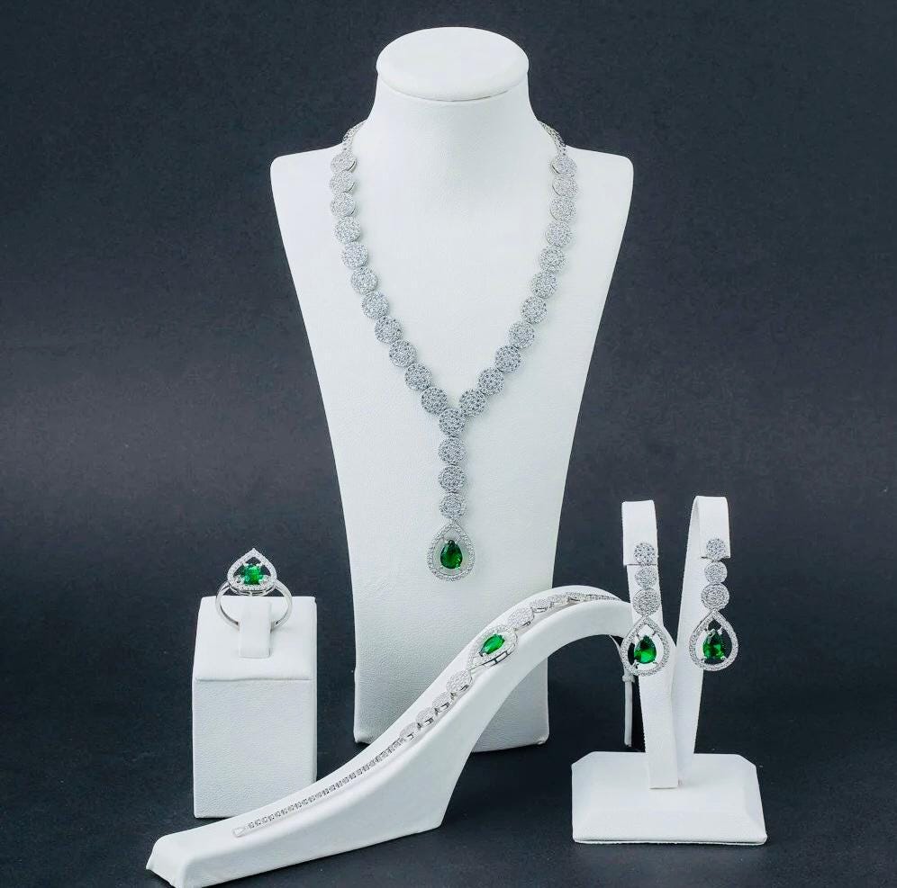 This exquisite jewelry set features brilliant green zircon stones set in solid 925 sterling silver. A complete 4-piece design offering timeless elegance and luxury — perfect for gifts, weddings, or daily elegance.