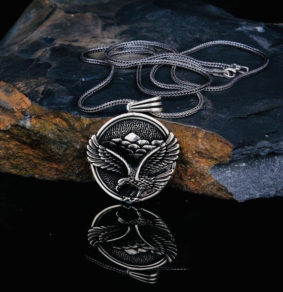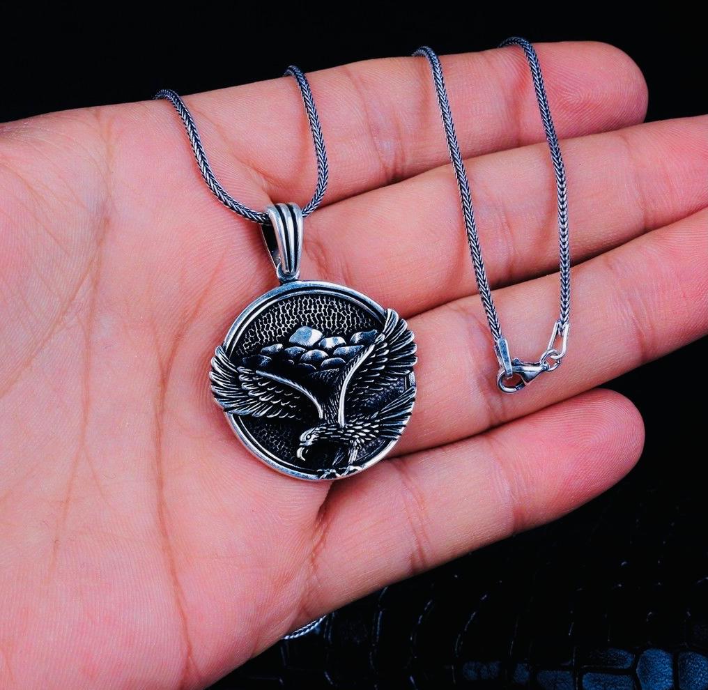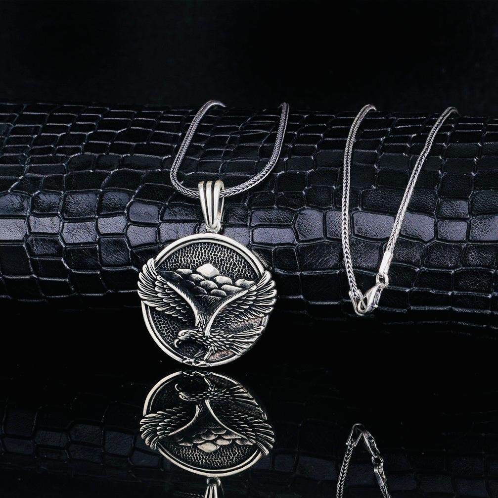 This eagle motif medallion necklace, crafted from 925 sterling silver, symbolizes power, freedom, and nobility. Its bold and elegant design makes it perfect for daily wear or as a meaningful gift for someone special.