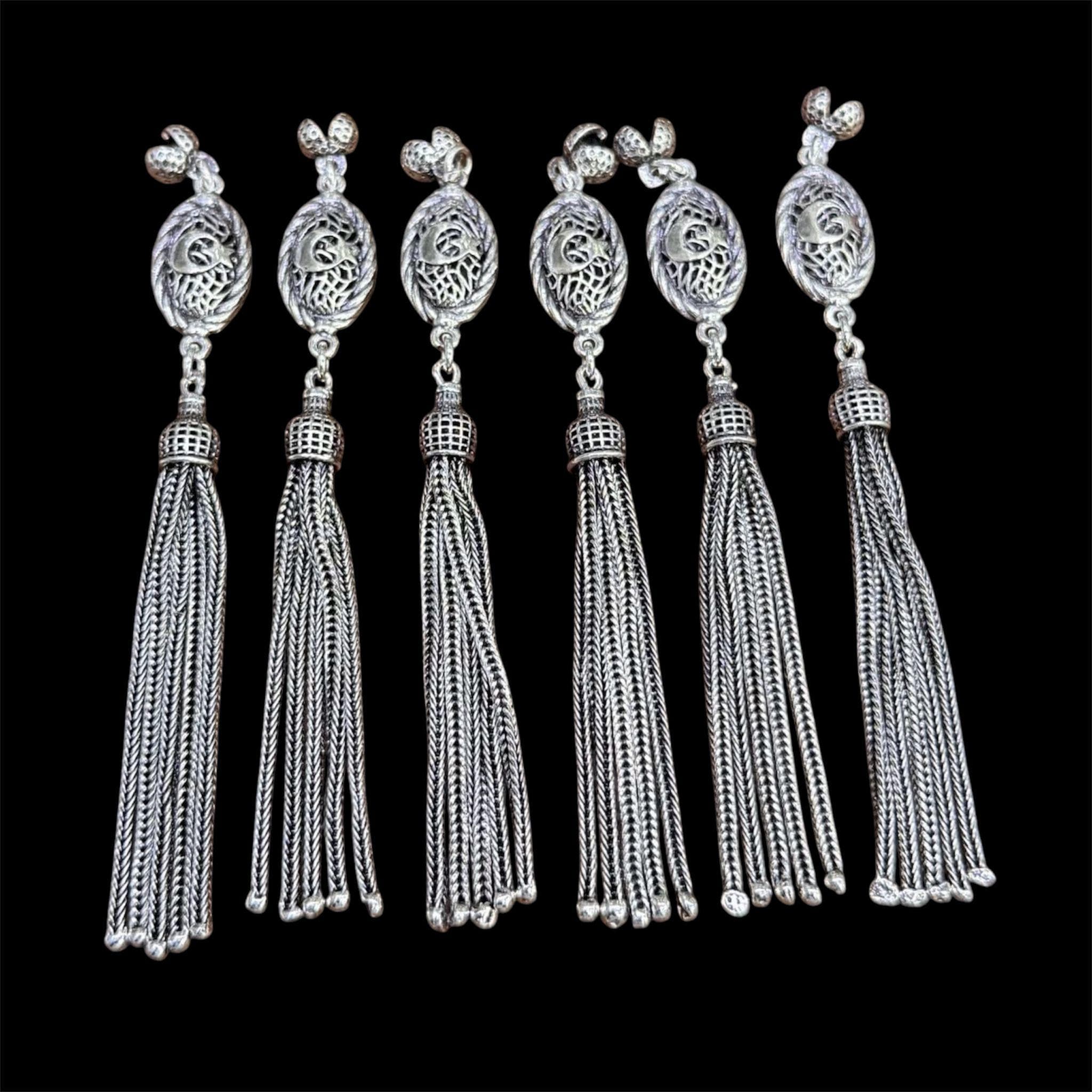 Product Details: • Material: 925 sterling silver • Design: Ottoman-style oval filigree with “Elif” motif, multi-chain ends • Use: Misbaha/tasbih making, repair, or custom designs • Handmade item • Sold as a single tassel