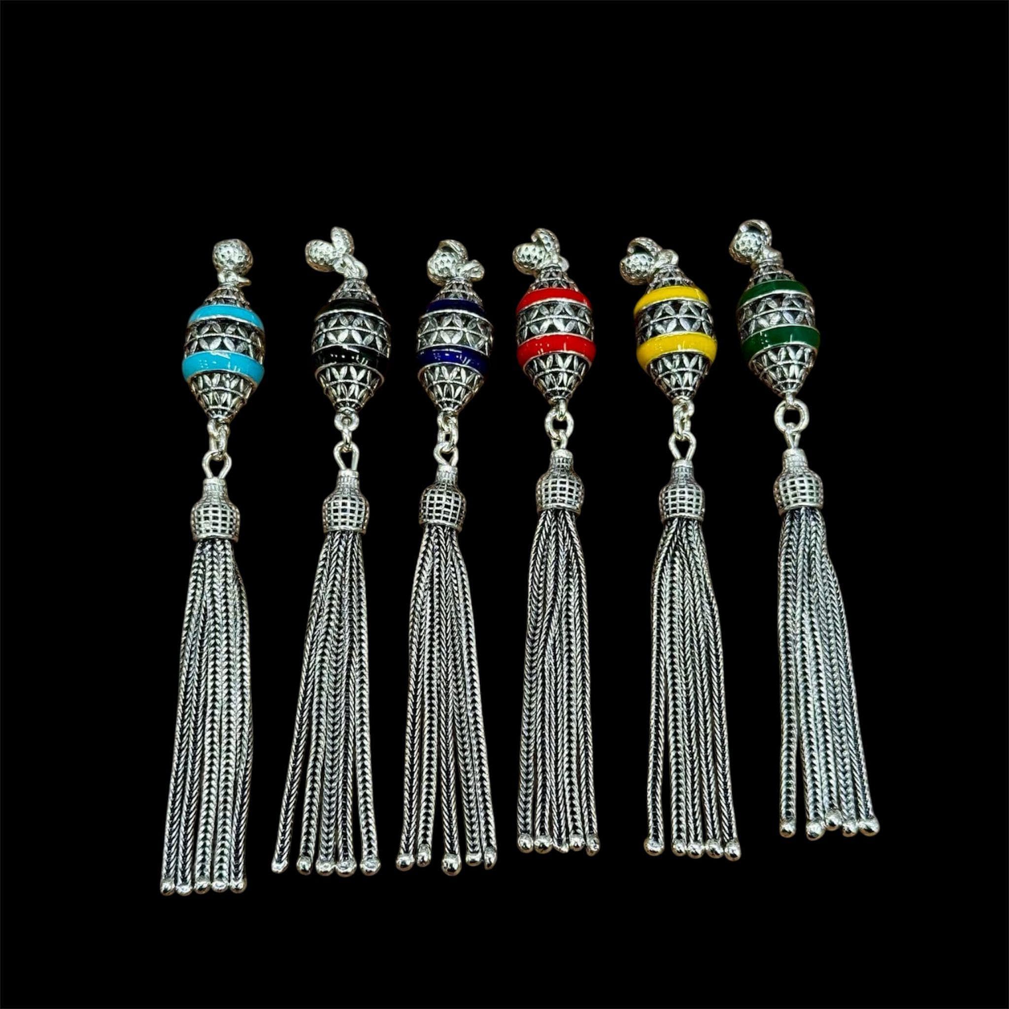 Handcrafted 925 sterling silver misbaha tassel featuring colorful enamel accents and fine filigree work. Each piece showcases vivid details with multiple silver chains, reflecting traditional Ottoman artistry.