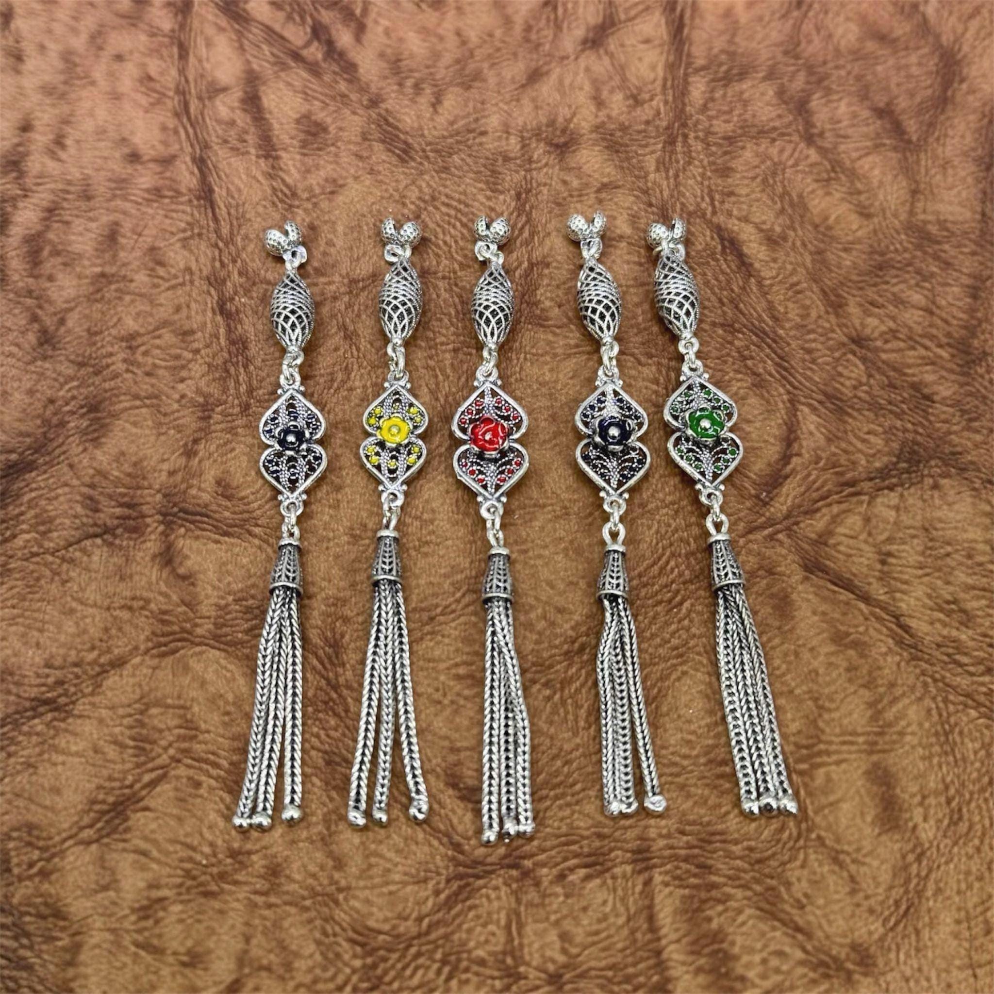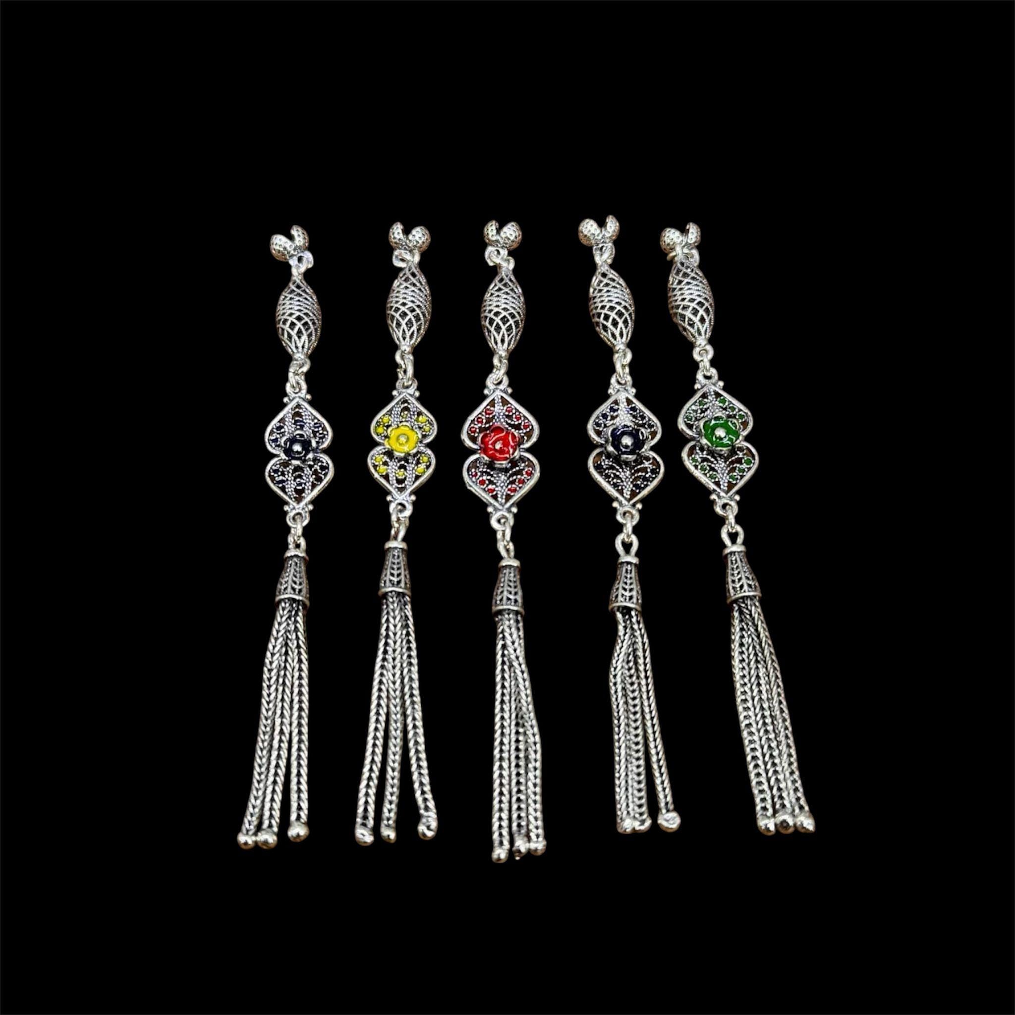 Product Details: * Material: 925 sterling silver * Stone colors: Red, Green, Blue, Yellow, Black * Design: Ottoman style with multi-chain tassel * Handmade craftsmanship * Sold as one tassel