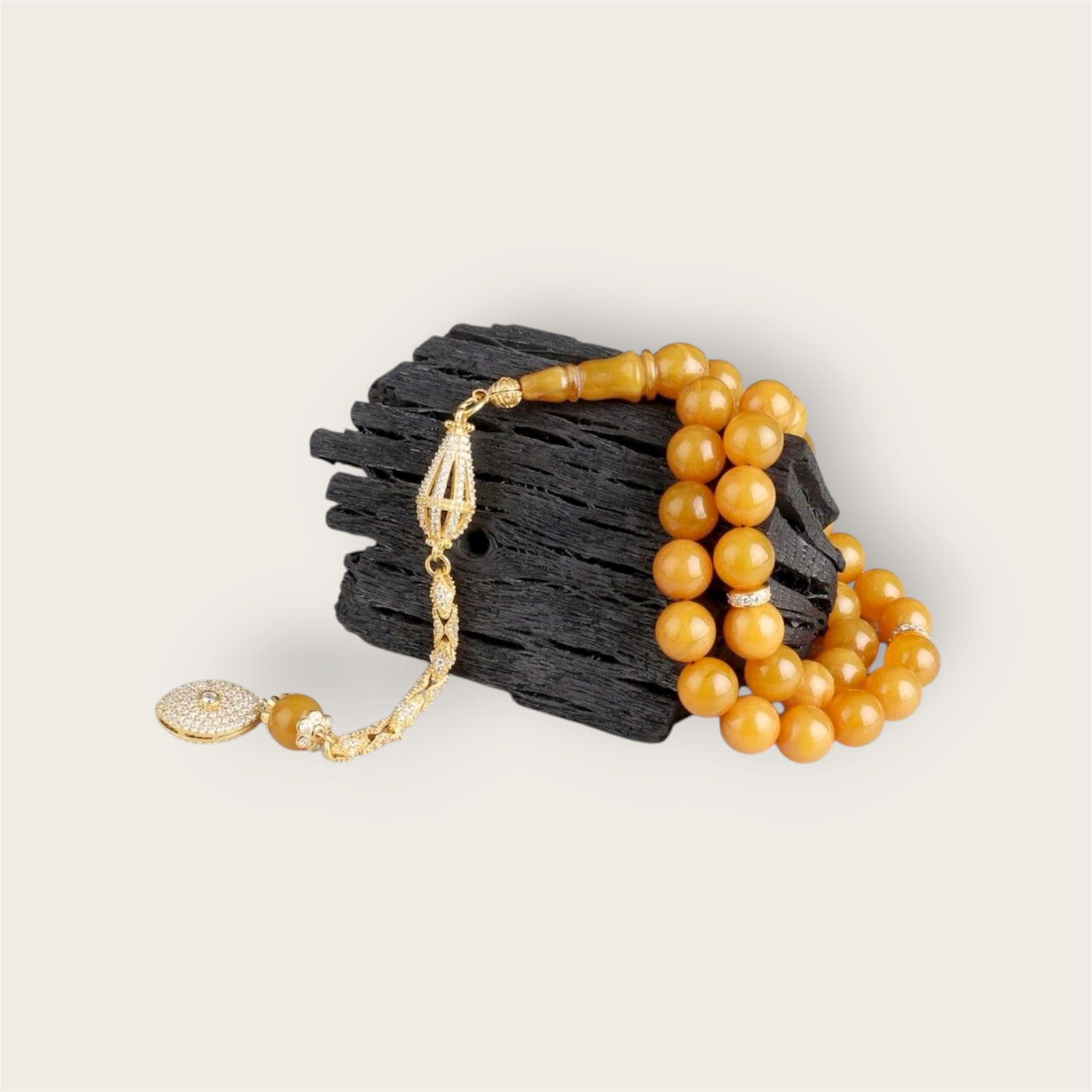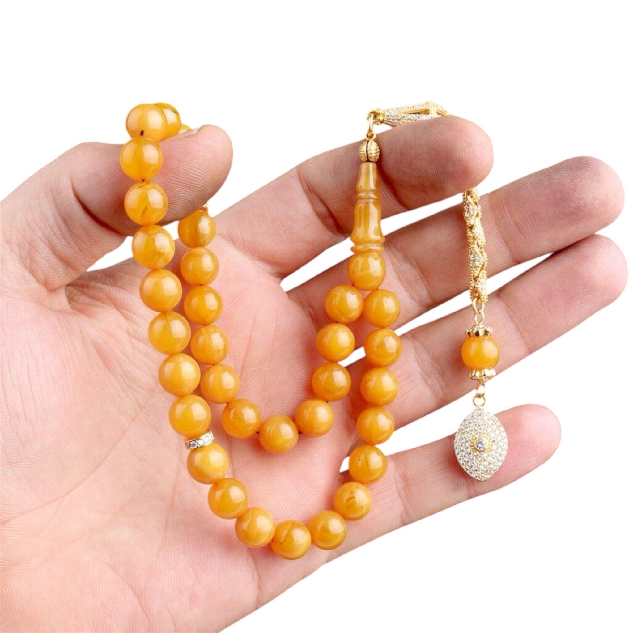 Handcrafted Fire Amber (Kehribar) Tasbih with 925 sterling silver and zircon-detailed tassel. Bright shine, smooth feel, and elegant craftsmanship — perfect for prayer or as a meaningful gift.