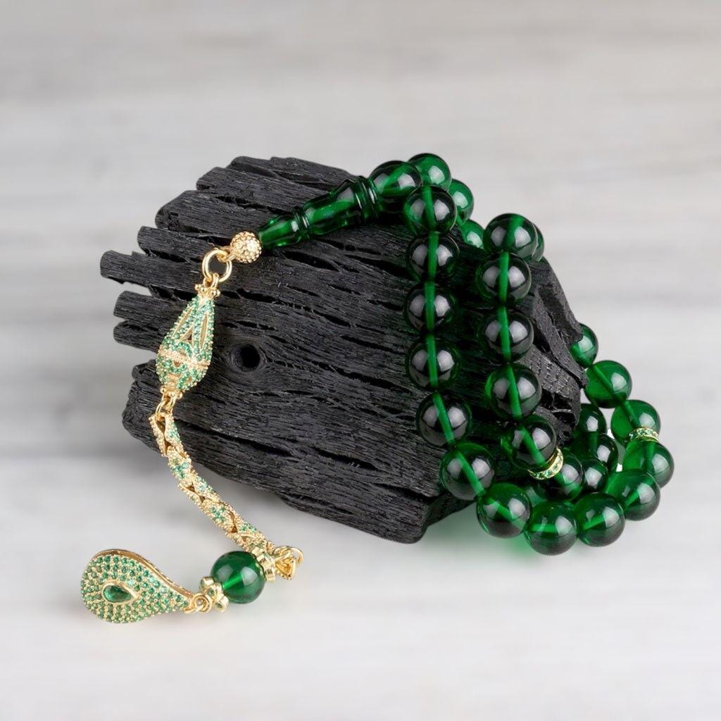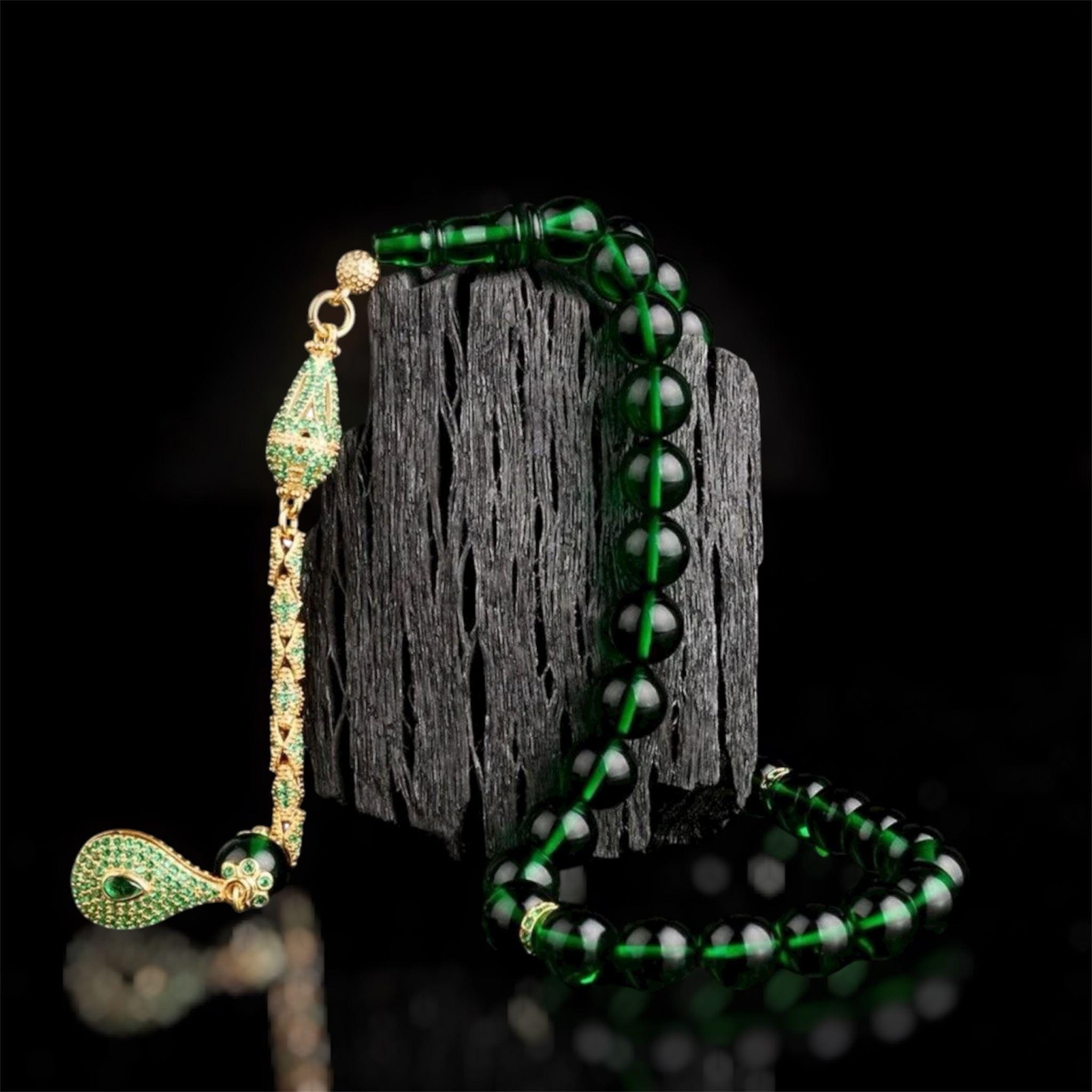 Green Fire Amber Tasbih 925 Silver Misbaha with Zircon Handmade Kehribar Prayer Beads