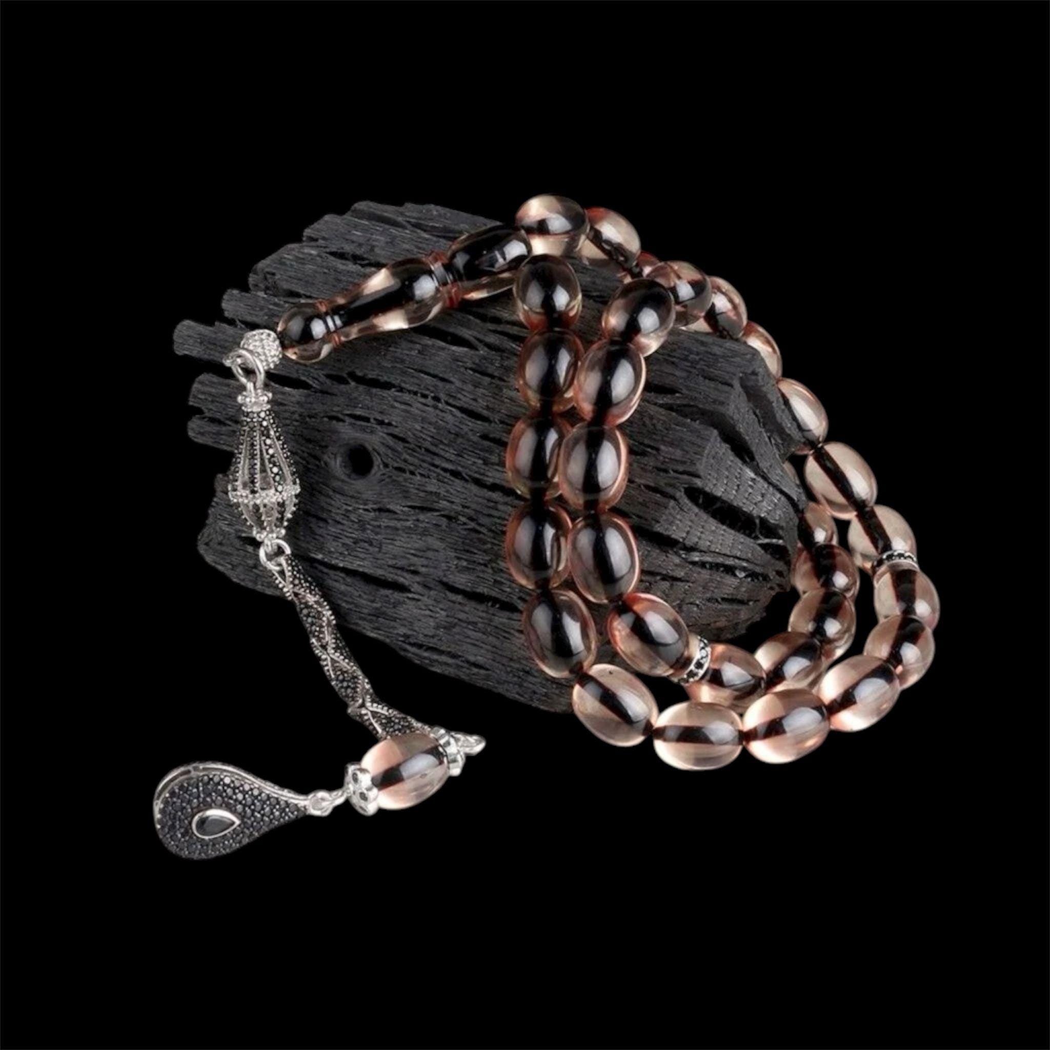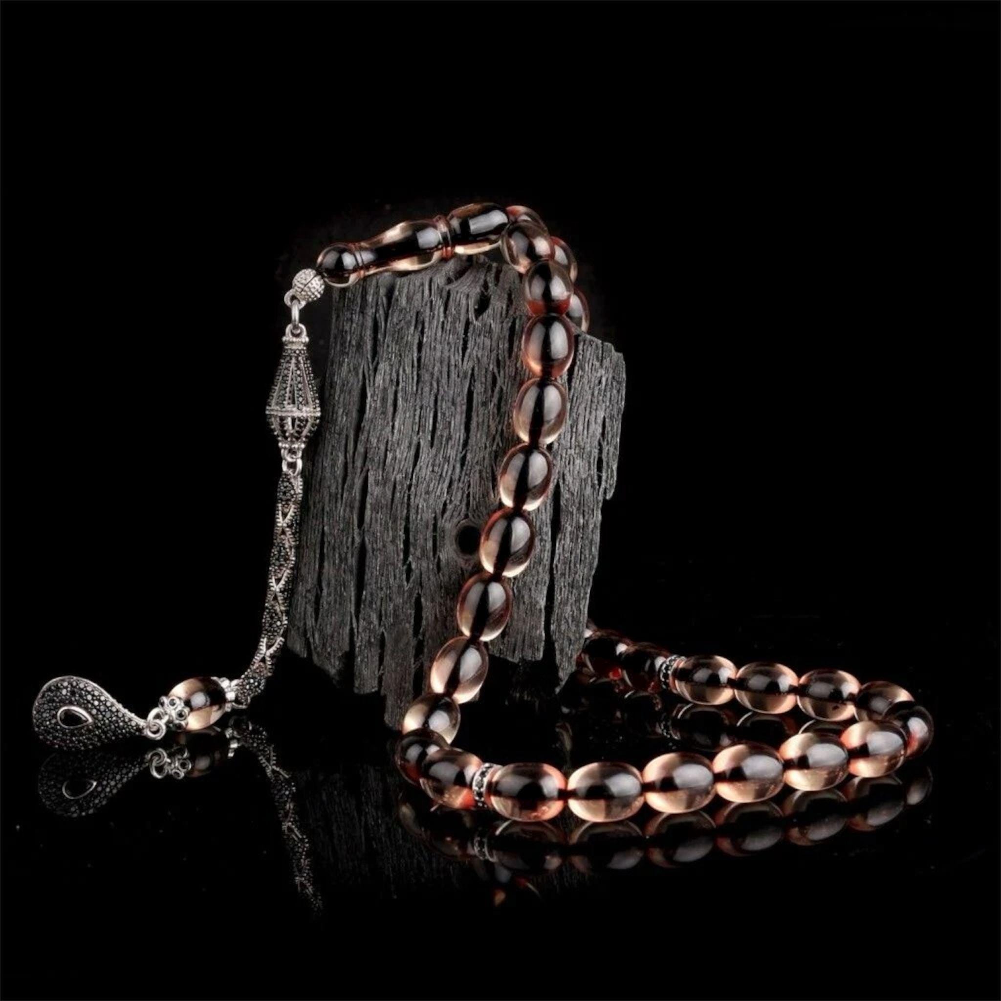 Smoke Fire Amber Tasbih 925 Silver Misbaha with Zircon Handmade Kehribar Prayer Beads