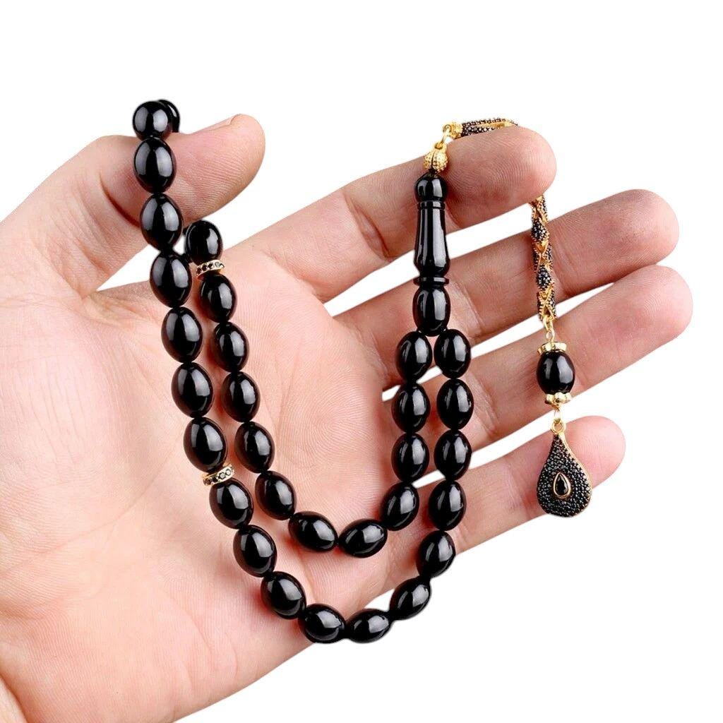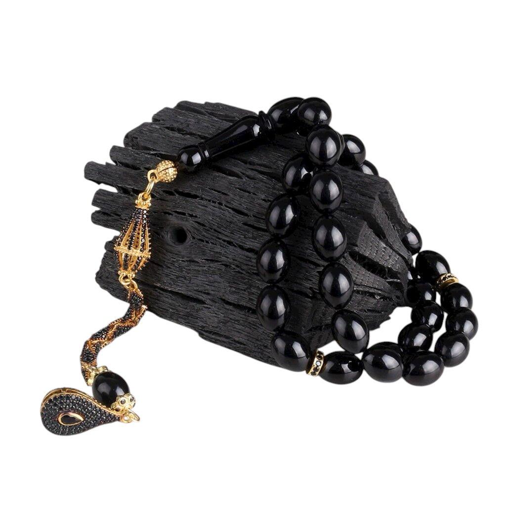 Black Fire Amber Tasbih | Gold Plated 925 Silver Misbaha with Zircon Tassel | Handmade Kehribar Prayer Beads
