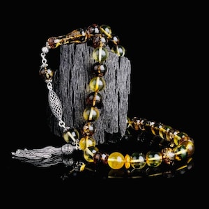 * Material: Gold Plated 925 Sterling Silver * Stone: Fire Amber (Pressed Kehribar) * Bead Size: 8×11 mm * Imam Length: 4 cm * Total Length: 30 cm * Tassel: Gold Plated Silver with Zircon