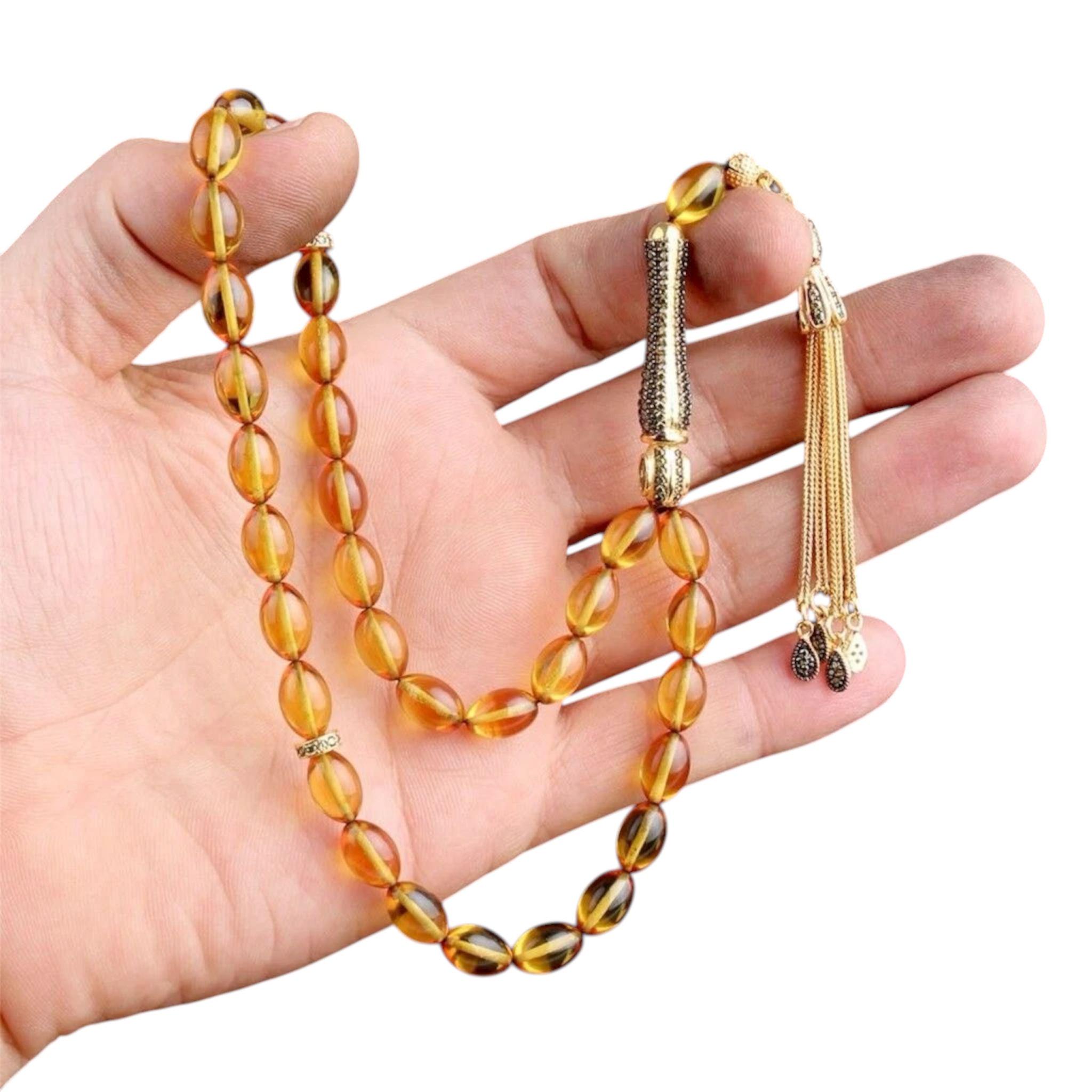 Handcrafted Honey Fire Amber (Kehribar) Tasbih with 925 sterling silver and zircon-detailed tassel. Smooth beads, elegant shine — perfect for daily use, prayer, or as a meaningful gift.