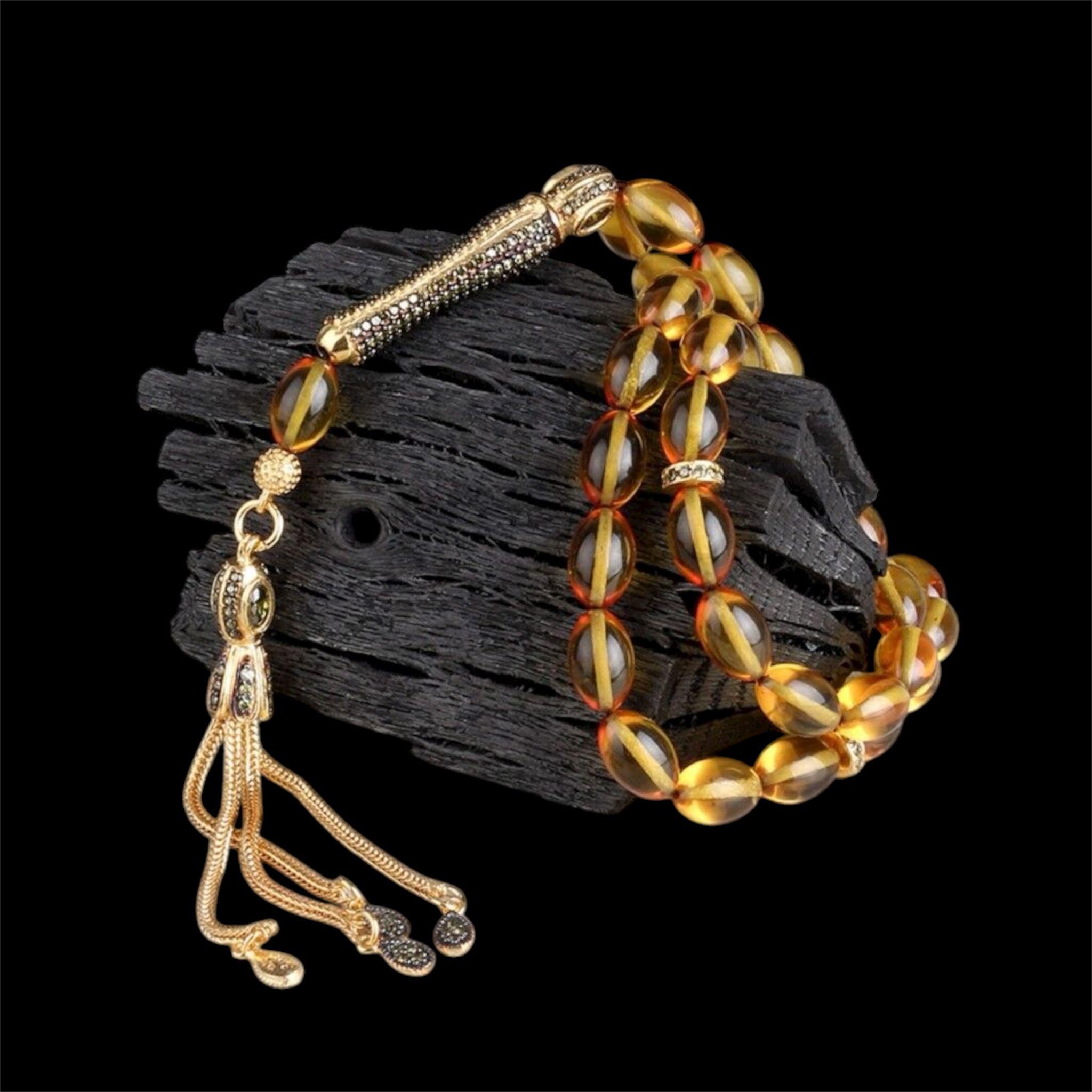Honey Fire Amber Tasbih | 925 Silver Misbaha with Zircon Tassel | Handmade Kehribar Prayer Beads