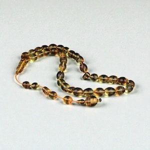 * Material: 925 Sterling Silver * Stone: Fire Amber (Pressed Kehribar) * Bead Size: 7×10 mm * Imam Length: 4 cm * Total Length: 28 cm * Tassel: Silver with Zircon