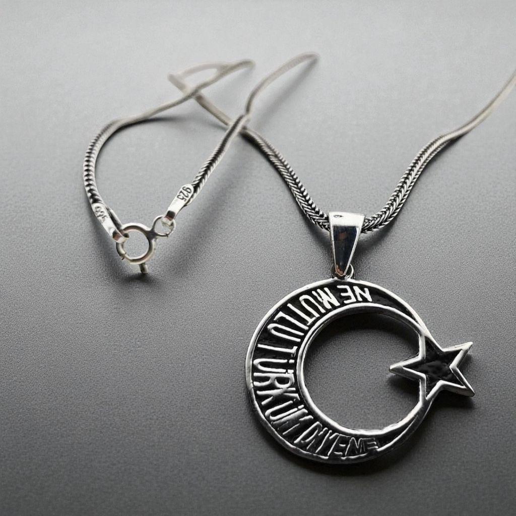 Sterling Silver Crescent-Star Necklace with “Ne Mutlu Türküm Diyene” Inscription