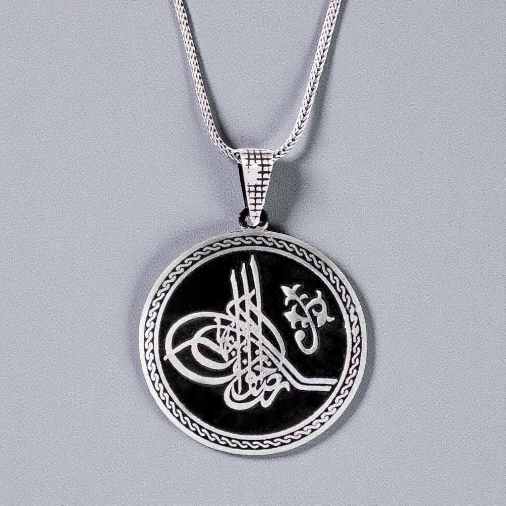 Description: Large Ottoman Tughra pendant crafted from solid 925 sterling silver. Heavy, detailed and suitable for daily wear. Comes with a 60 cm sterling silver chain and ships gift-ready. Pendant weight 10.5 g Total weight 16 g Chain length 60 cm Material 925 sterling silver