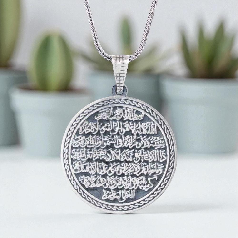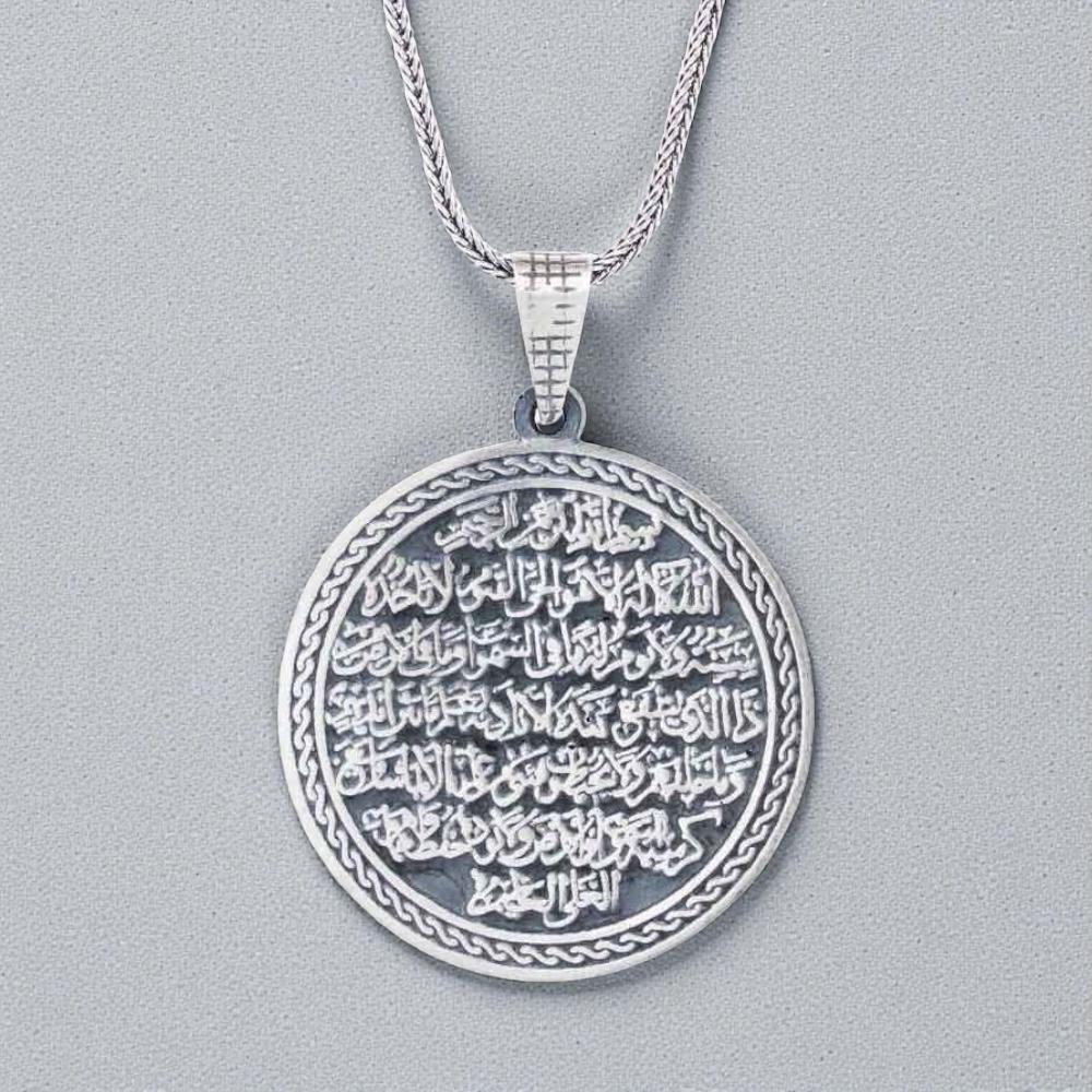 Description: Ayat al Kursi pendant made from solid 925 sterling silver. Durable, detailed and suitable for daily wear. Includes a 60 cm sterling silver chain. Ships in a gift box. Pendant weight 11 g Total weight 16.5 g Chain length 60 cm Material 925 sterling silver