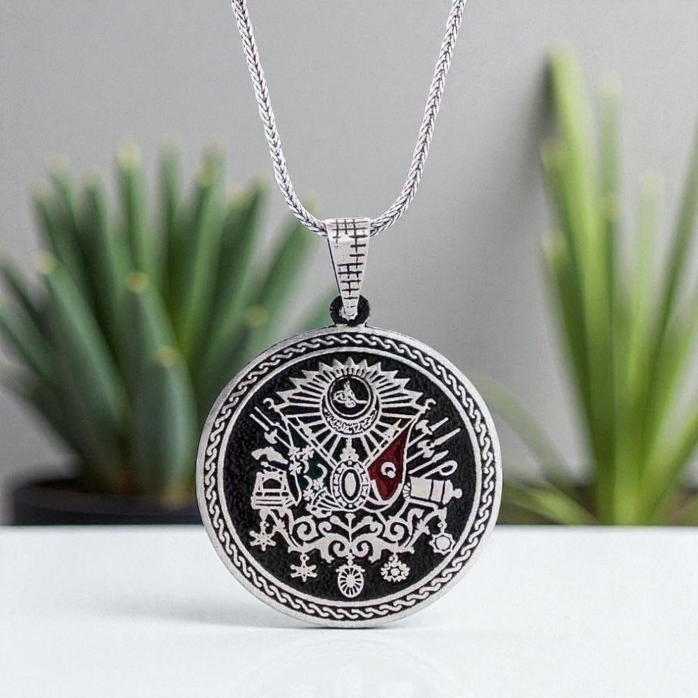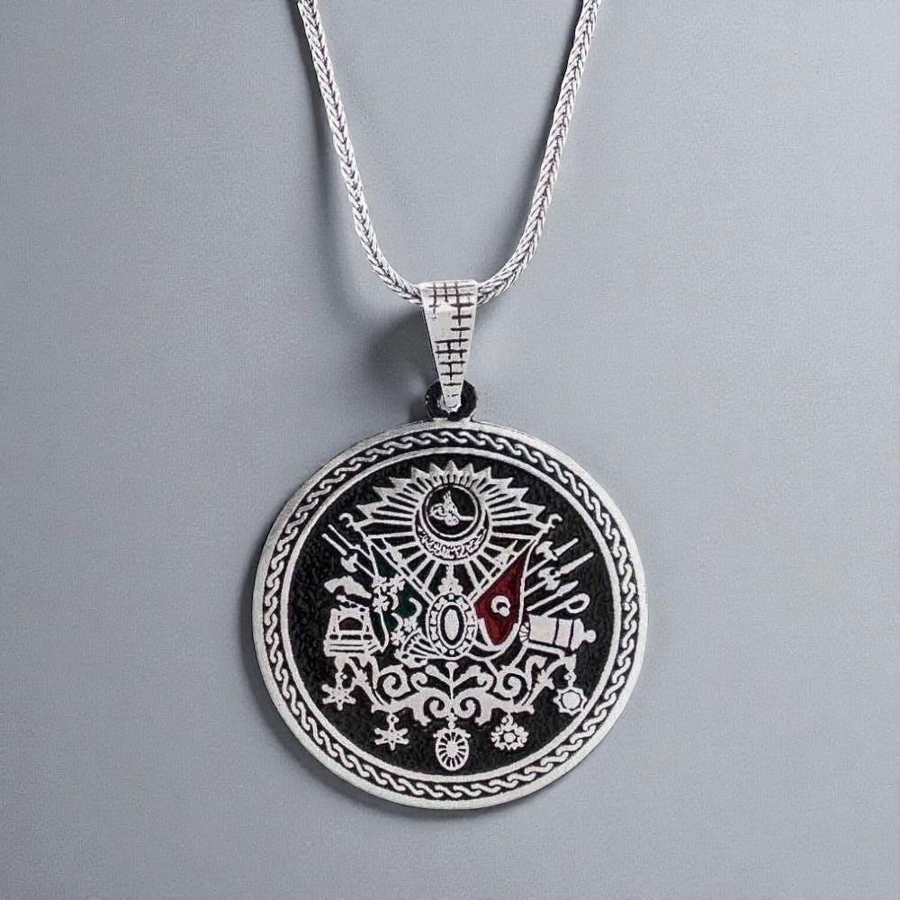 Description: A bold and detailed men’s necklace featuring the historic Ottoman Coat of Arms, crafted from solid 925 sterling silver. Ideal for heritage lovers and a meaningful gift option. Comes in a gift box. Pendant weight: 10 g Total weight: 15.5 g Material: 925 sterling silver