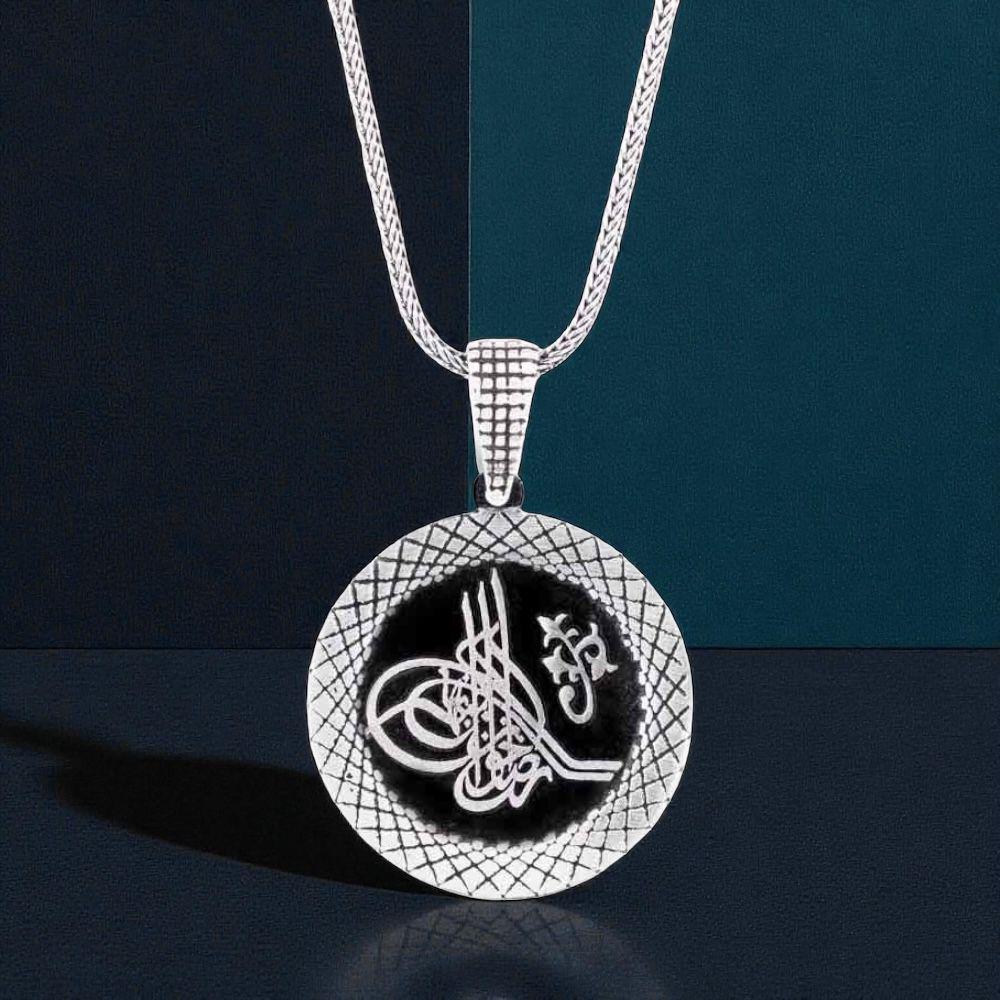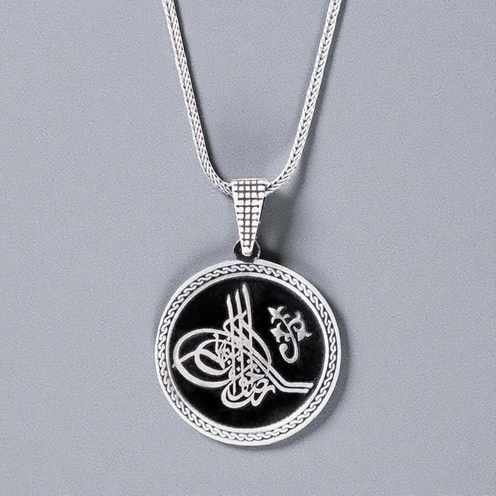 Description: Detailed Ottoman Tughra pendant crafted from solid 925 sterling silver. Perfect for daily wear or as a meaningful gift. Comes with your choice of chain length and ships in a gift box. Pendant weight: 7 g Total weight: 12.5 g Chain lengths available: 45–75 cm Material: 925 sterling silver