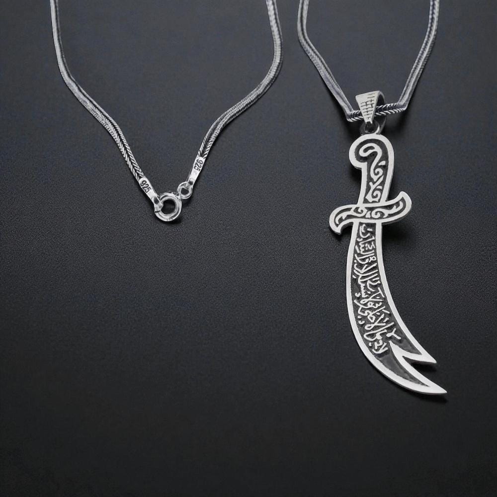 Description: A beautifully crafted Zulfiqar sword pendant featuring the inscription “La ilaha illallah Muhammadur Rasulullah.” Made from solid 925 sterling silver — a meaningful spiritual gift for him. Comes in a gift box. Pendant weight: 5.2 g Total weight: 11.2 g Material: 925 sterling silver