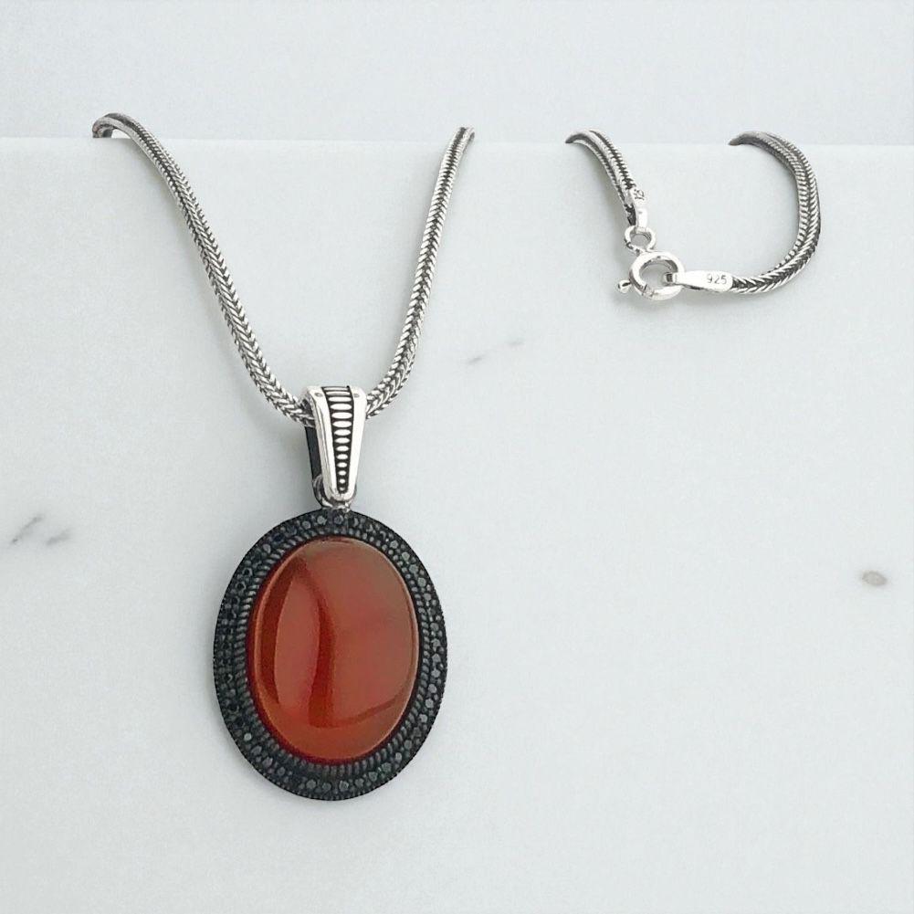 * Material: 925 Sterling Silver * Stone: Red Agate * Pendant Weight: 7.25 g * Chain Weight: 6.50 g * Total Weight: 13.75 g * Chain Type: Fox Tail Chain * Size: 2.5 × 2 cm * Gift box included.