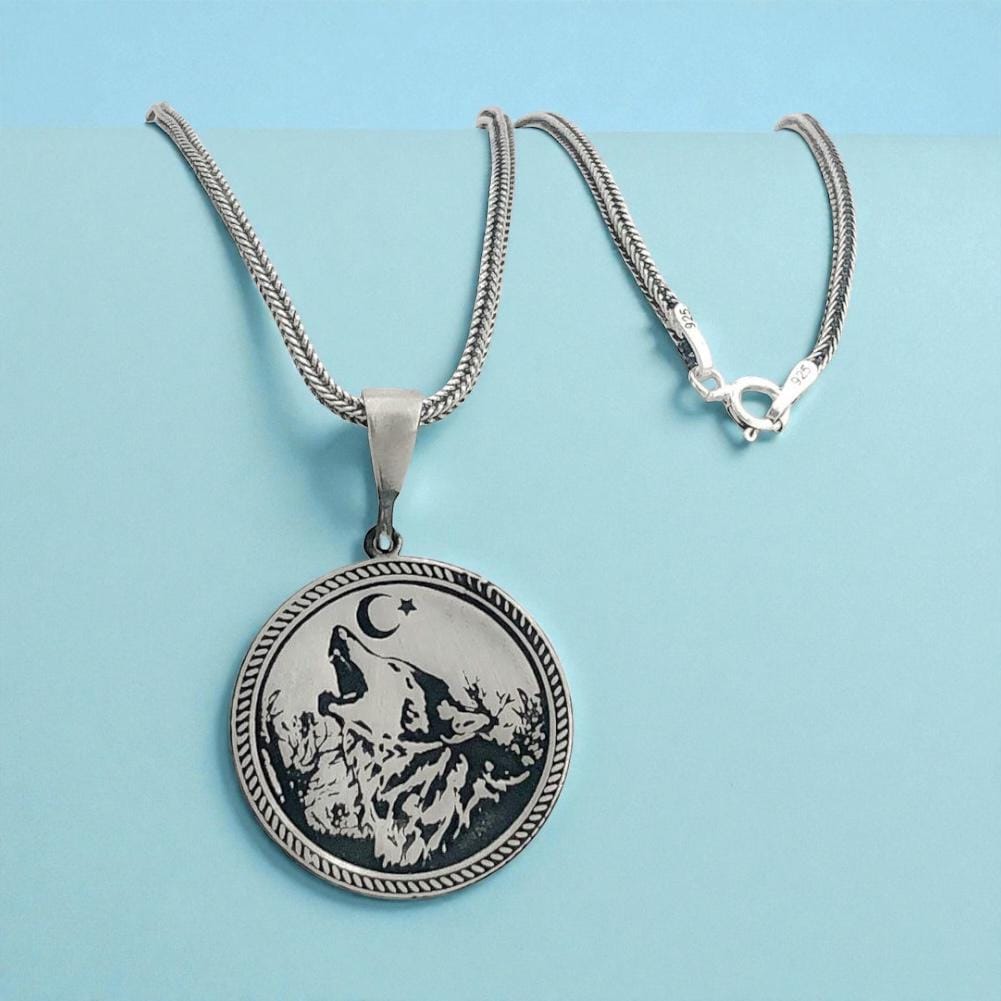 Description: A meaningful men’s necklace combining the crescent-star symbol with the iconic wolf emblem. Crafted from solid 925 sterling silver and paired with a 60 cm fox-tail chain. A perfect cultural and symbolic gift. Ships in a gift box.