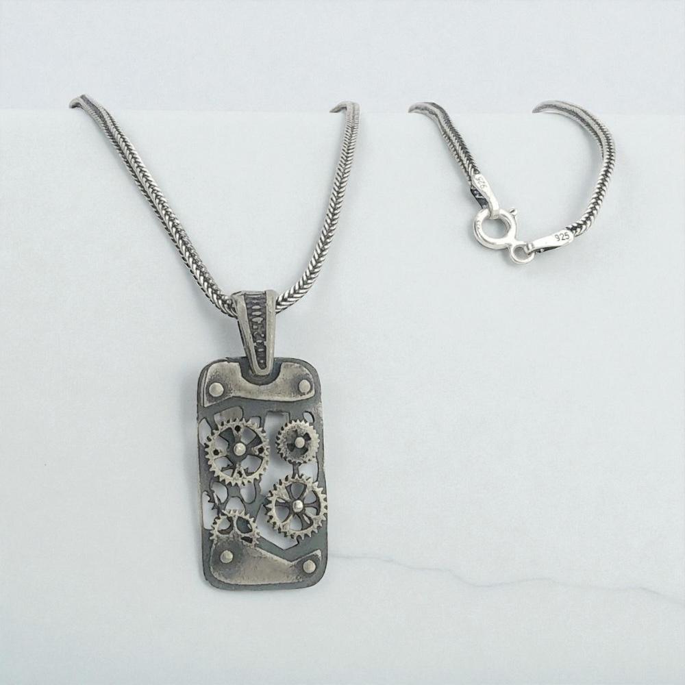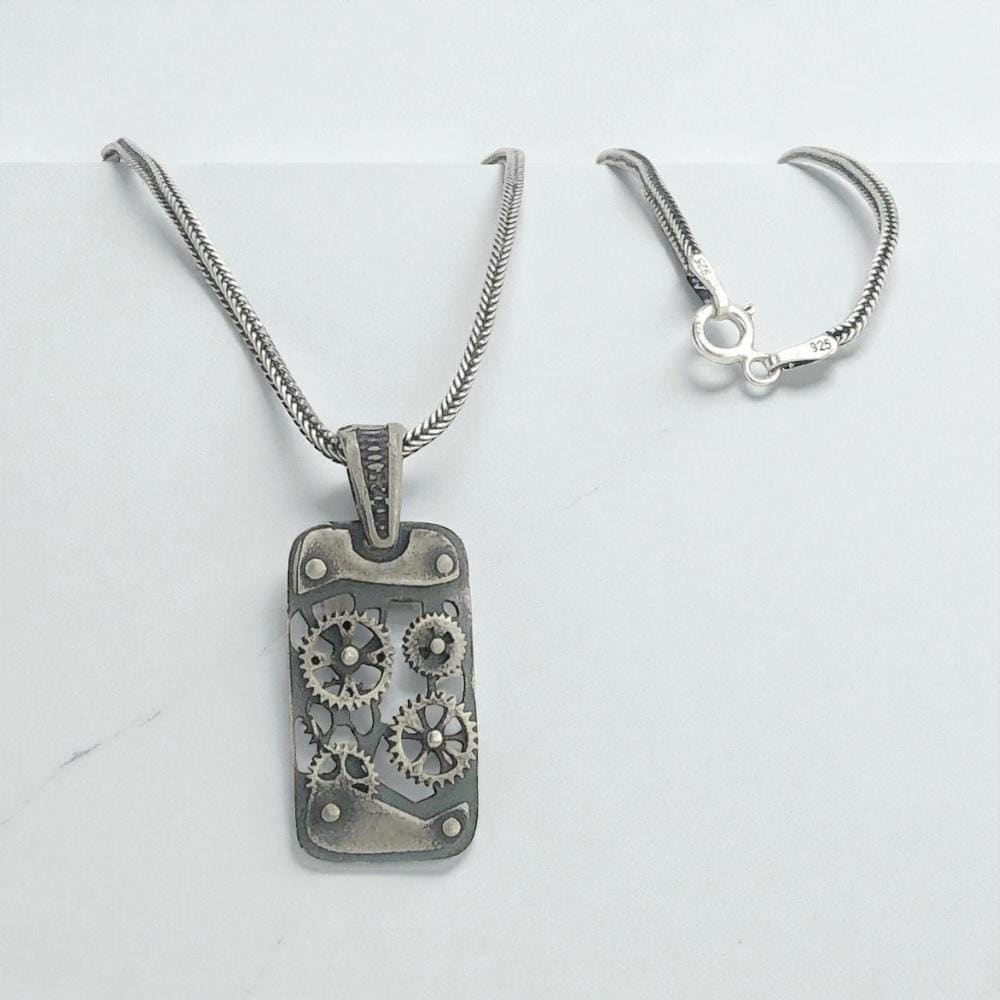 Description: A sleek mechanism-inspired necklace crafted from solid 925 sterling silver. Features a durable 60 cm fox-tail chain and a detailed mechanism pendant. Lightweight, modern and perfect as a meaningful gift. Ships in a gift box.