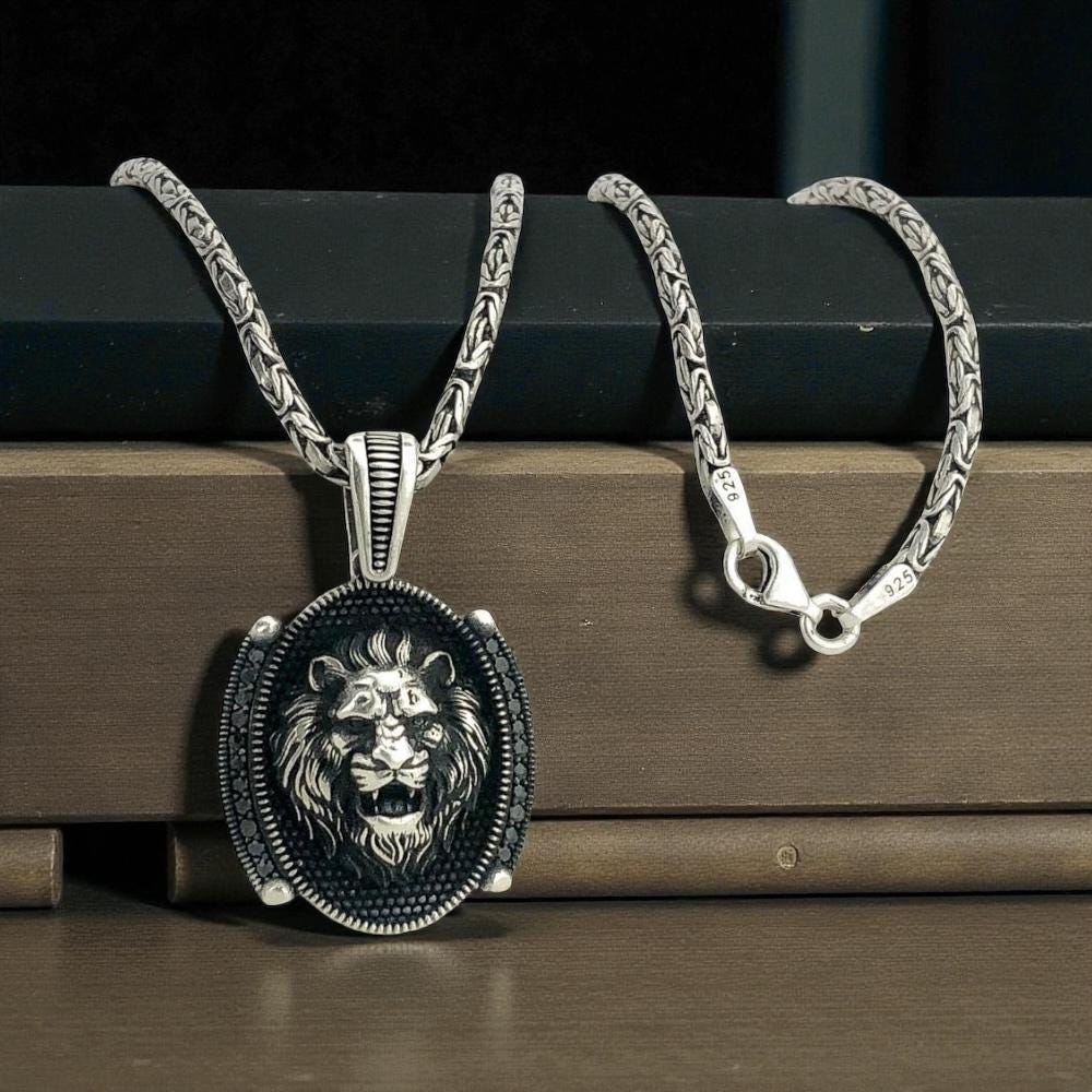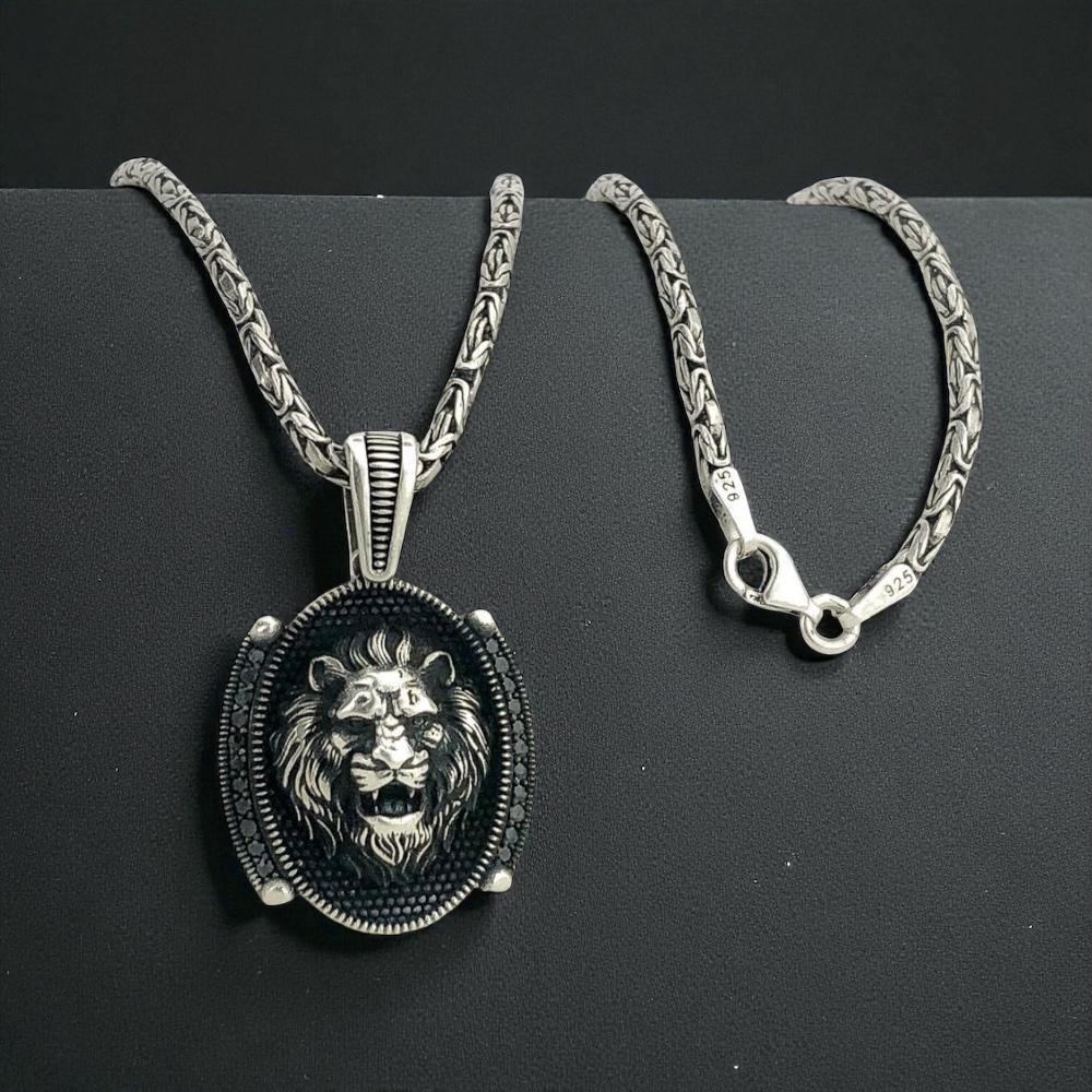 925 Sterling Silver Black Stone Lion Pendant with King Chain