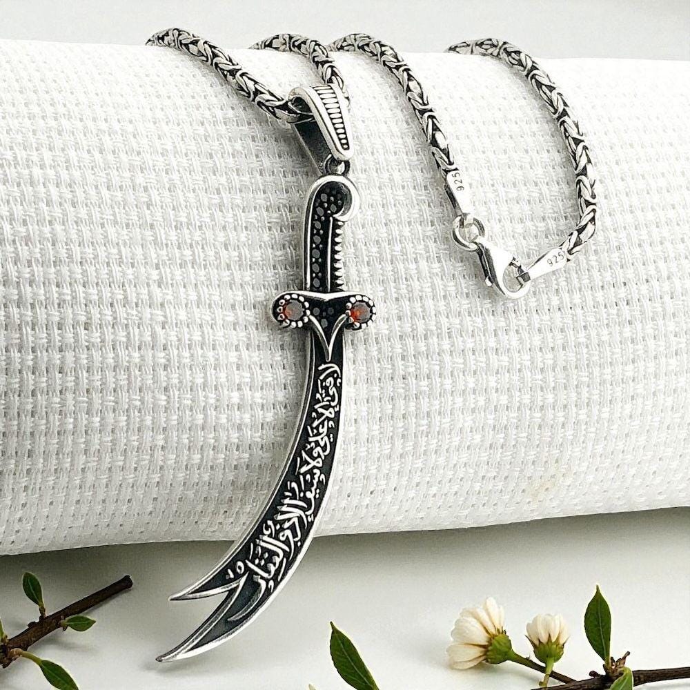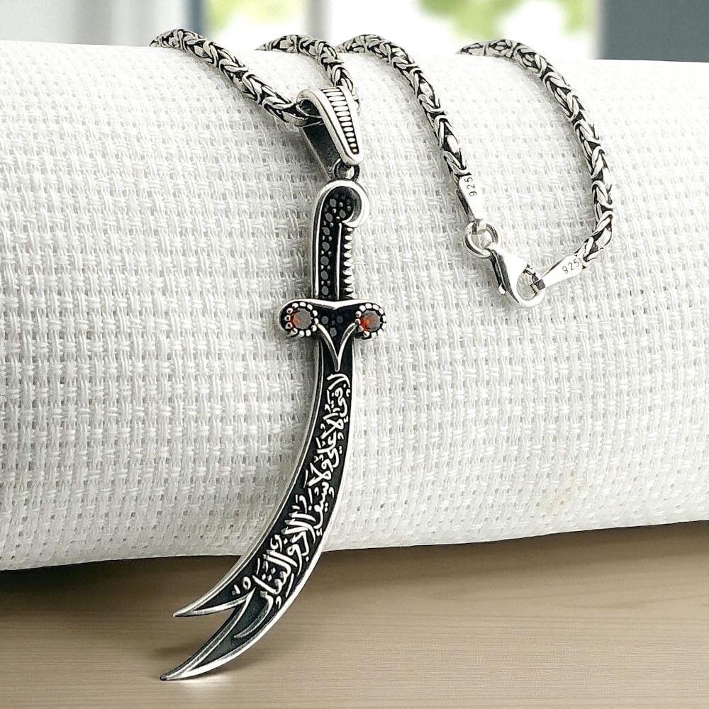 925 Sterling Silver Zulfiqar Necklace with red stone and the inscription La Feta İlla Ali La Seyfe İlla Zülfikar. A meaningful and bold piece for those who appreciate symbolic jewelry.