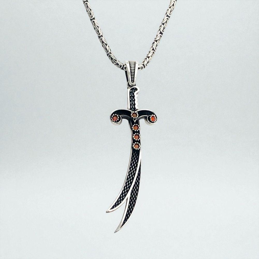 925 Sterling Silver Red Stone Zulfiqar Sword Necklace with Heavy King Chain