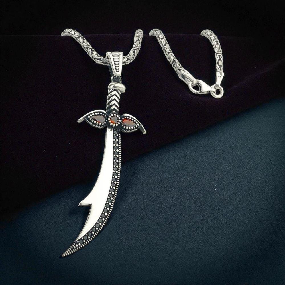 925 Sterling Silver Red Stone Zulfiqar Sword Pendant with Heavy King Chain