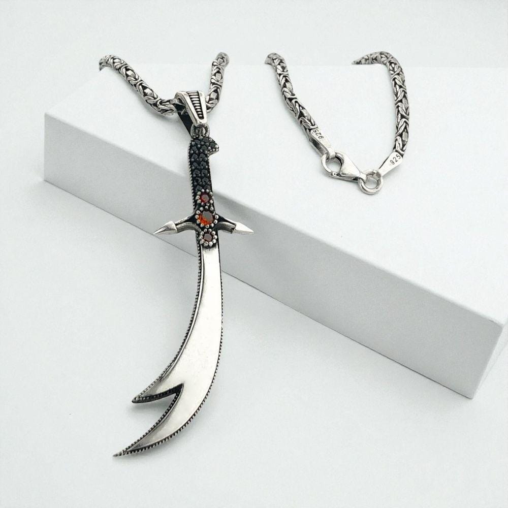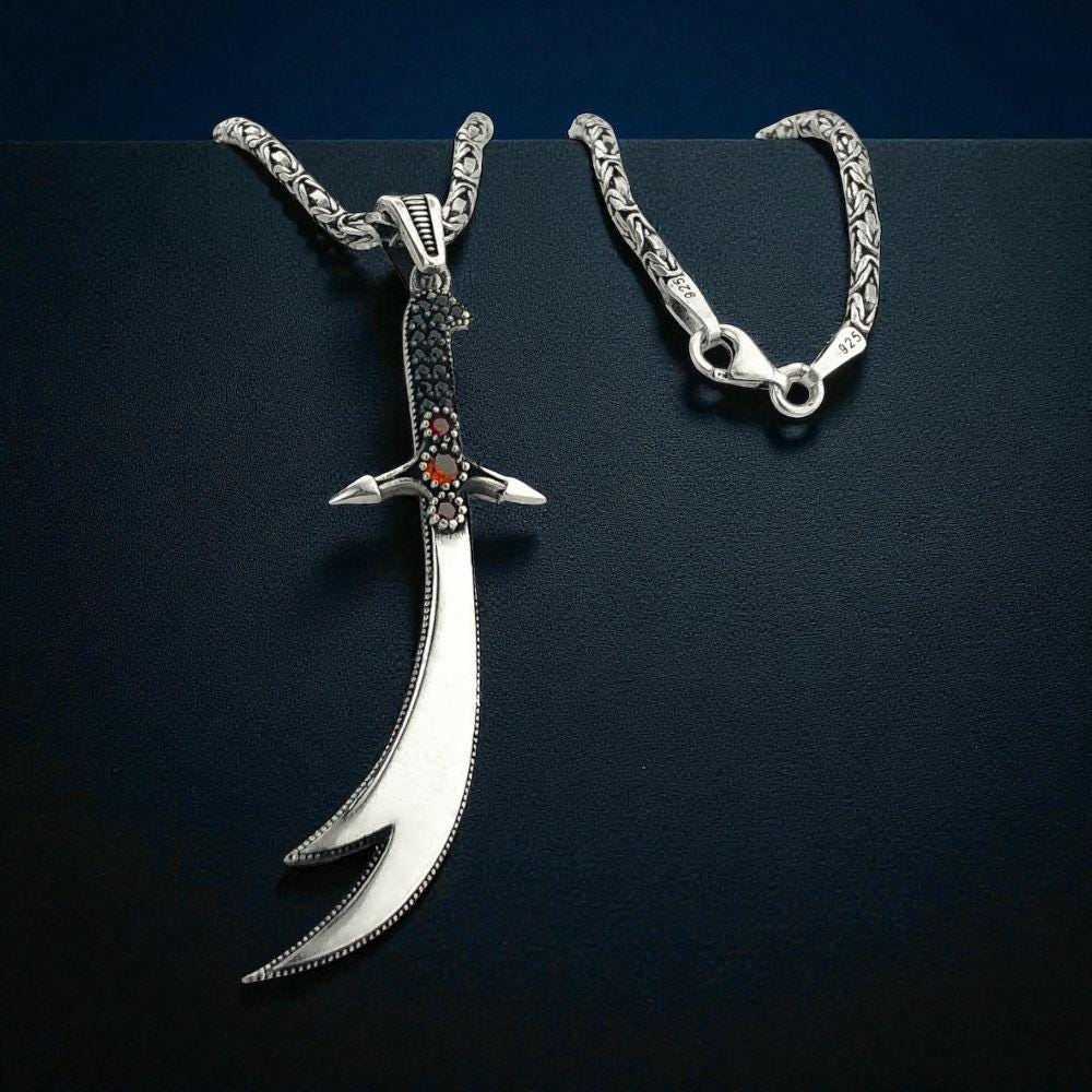 925 Sterling Silver Zulfiqar Sword Pendant with Red Stone – Heavy King Chain